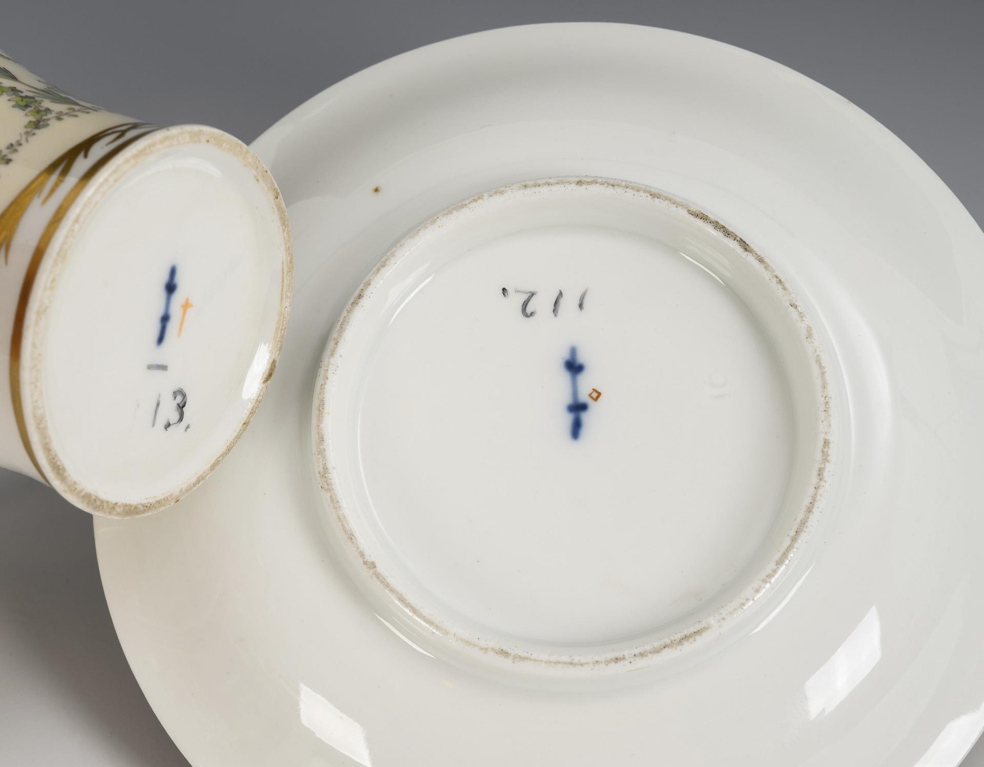 Polychrom bemalt (Tasse), polychromes Dekor (Untertasse), goldstaffiert. Tasse (H 9,5 cm), originale Untertasse (Ø 14,5 cm).