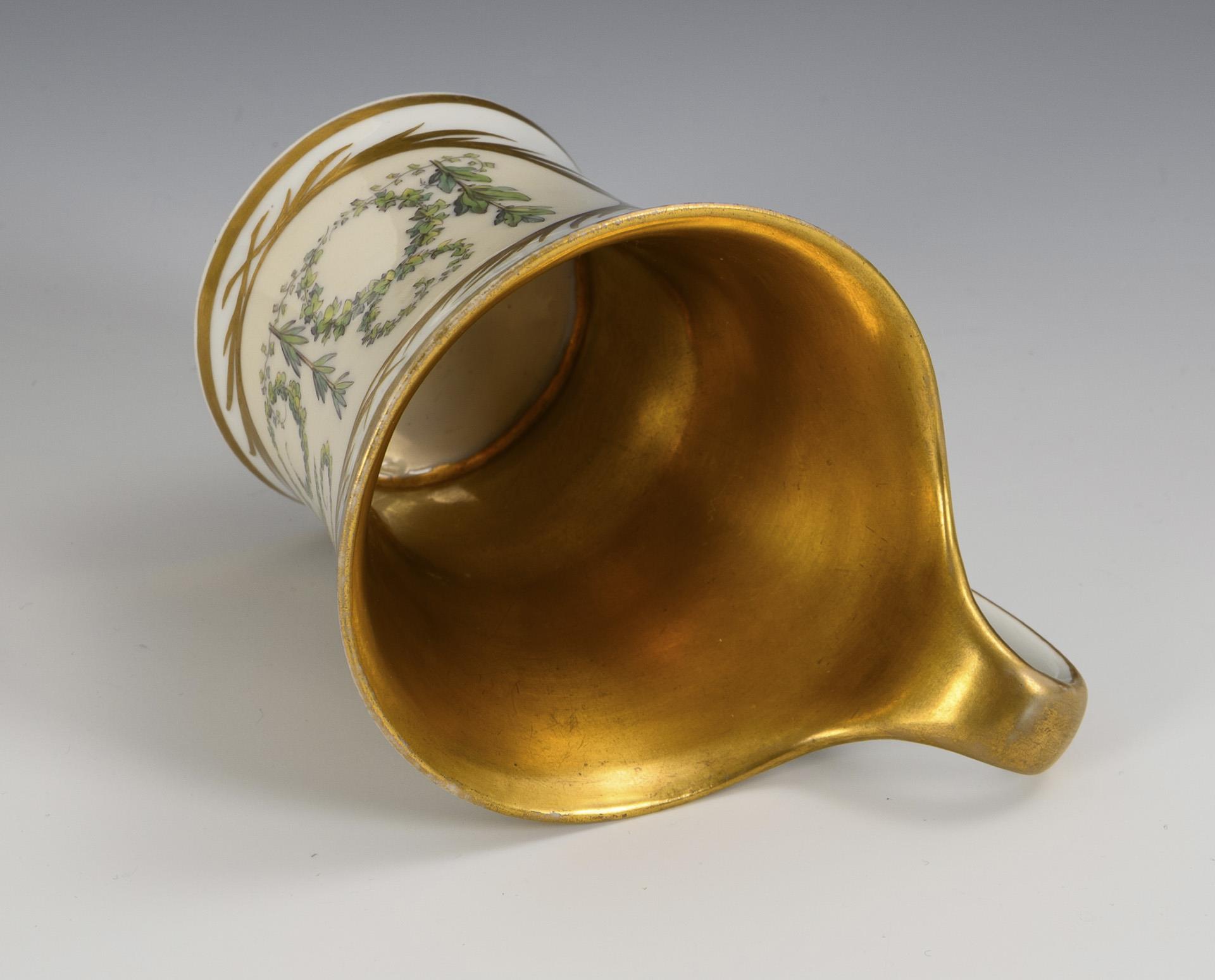 Modell "Konisch" mit Campanerhenkel. In einem Ovalmedaillon die aus Eichen-, Lorberr-, Ölbaum- und Efeublättern gebildete Jahreszahl "1813", im Spiegel der Untertasse das Dekorbild der Schlacht mit der Bezeichnung "Völkerschlacht bei Leipzig am 18. und 19. Oct.".