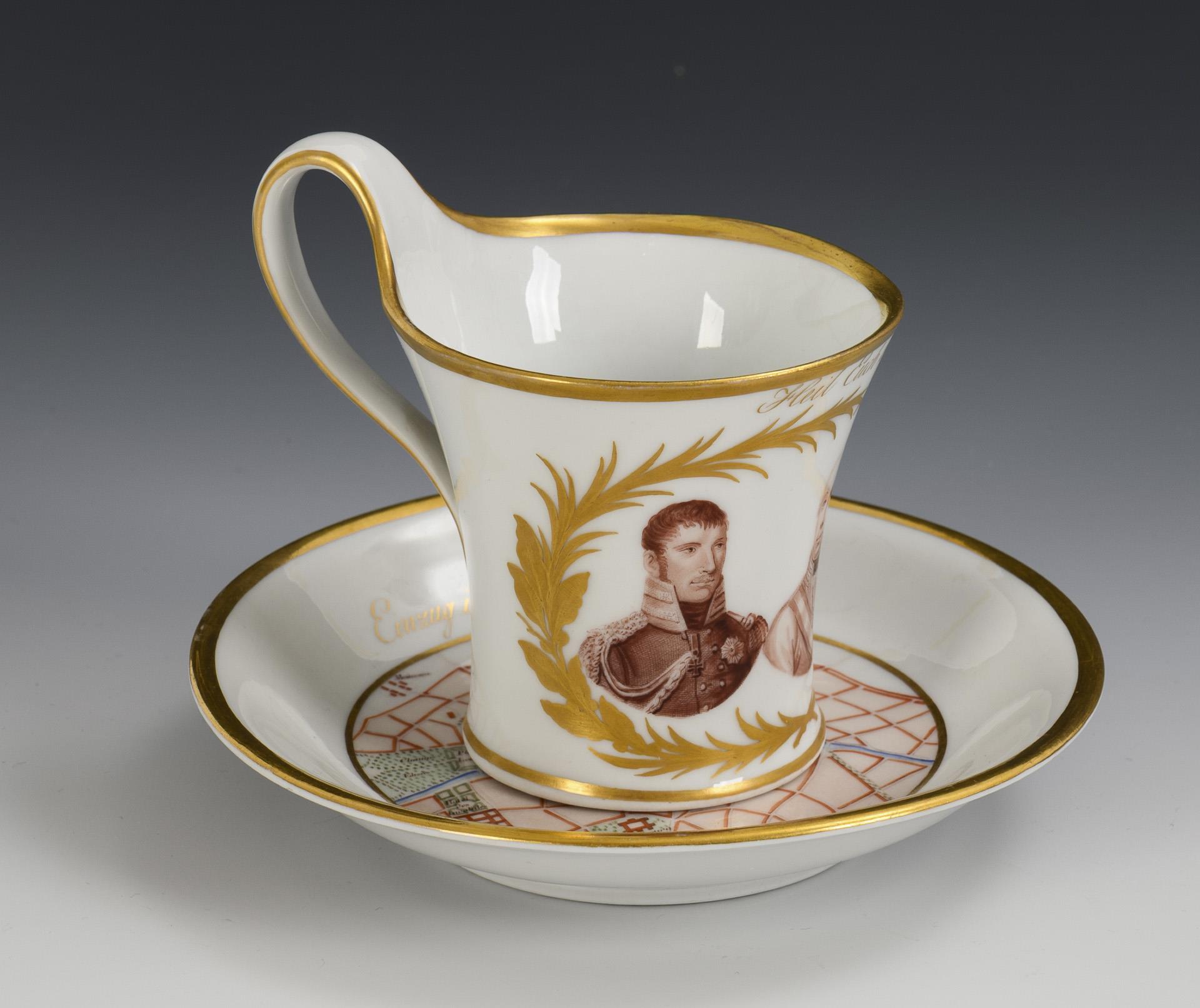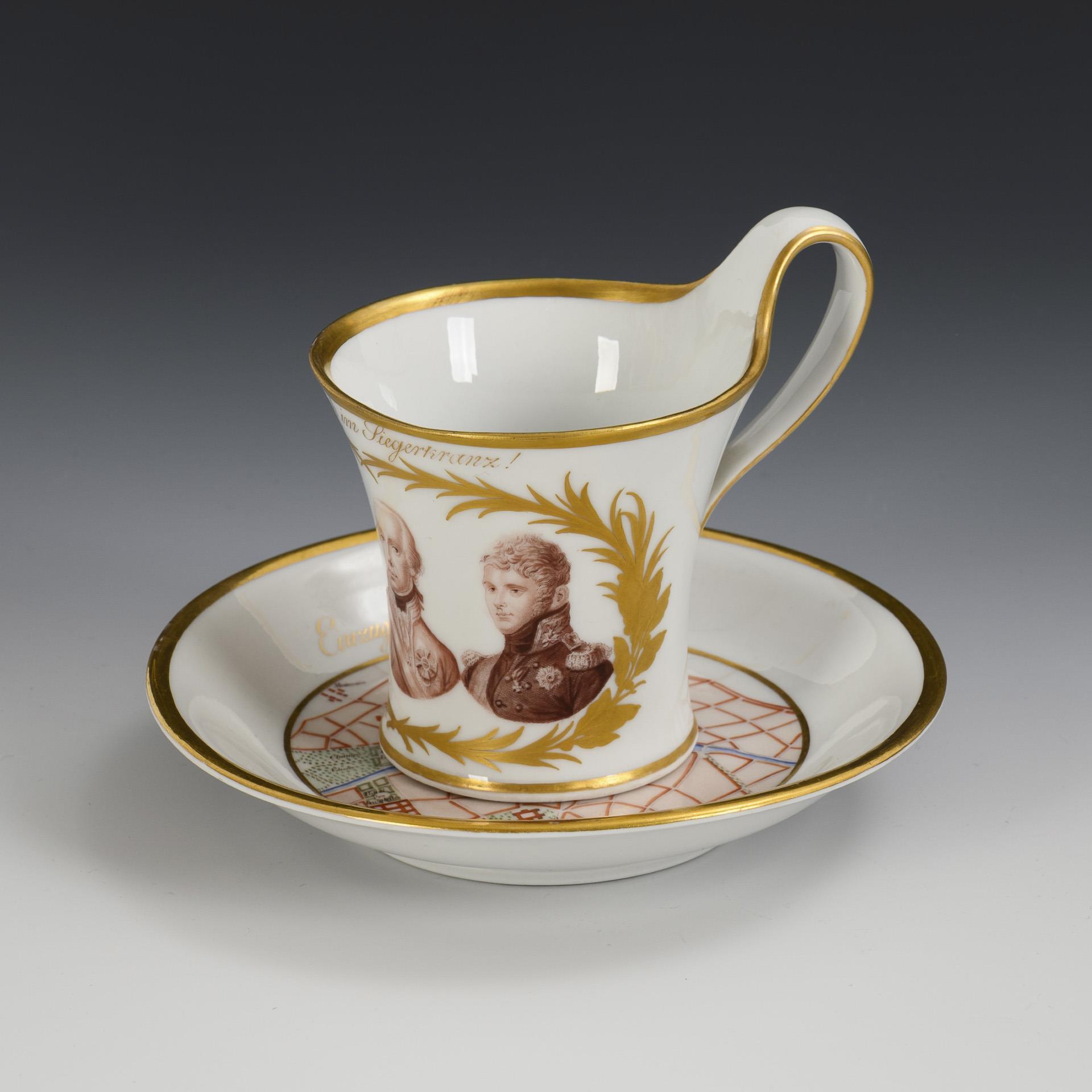 Modell "Konisch" mit Campanerhenkel. Schauseitig ein eichenlaub- und palmwedelgerahmtes Medaillon mit den Bildnissen Friedrich Wilhelms III., Johann David Ludwig Graf Yorck von Wartenburgs und Zar Alexanders I., darüber die Losung "Heil Euch im Siegerkranz!". Im Spiegel der Untertasse die topografische Darstellung des Schlachtplans auf dem Montmartre, beschriftet "Einzug in Paris, 31. Maerz 1814.".