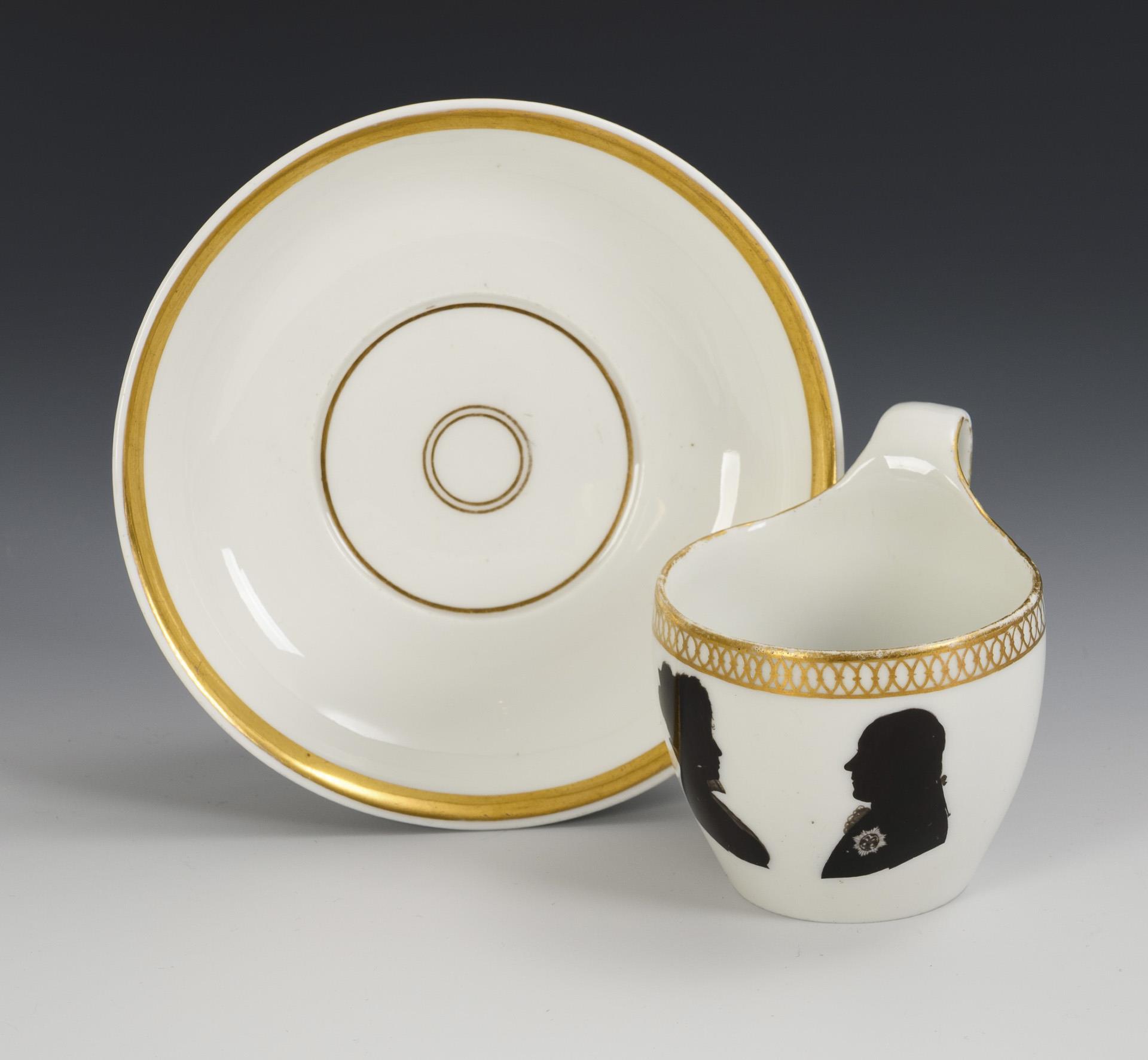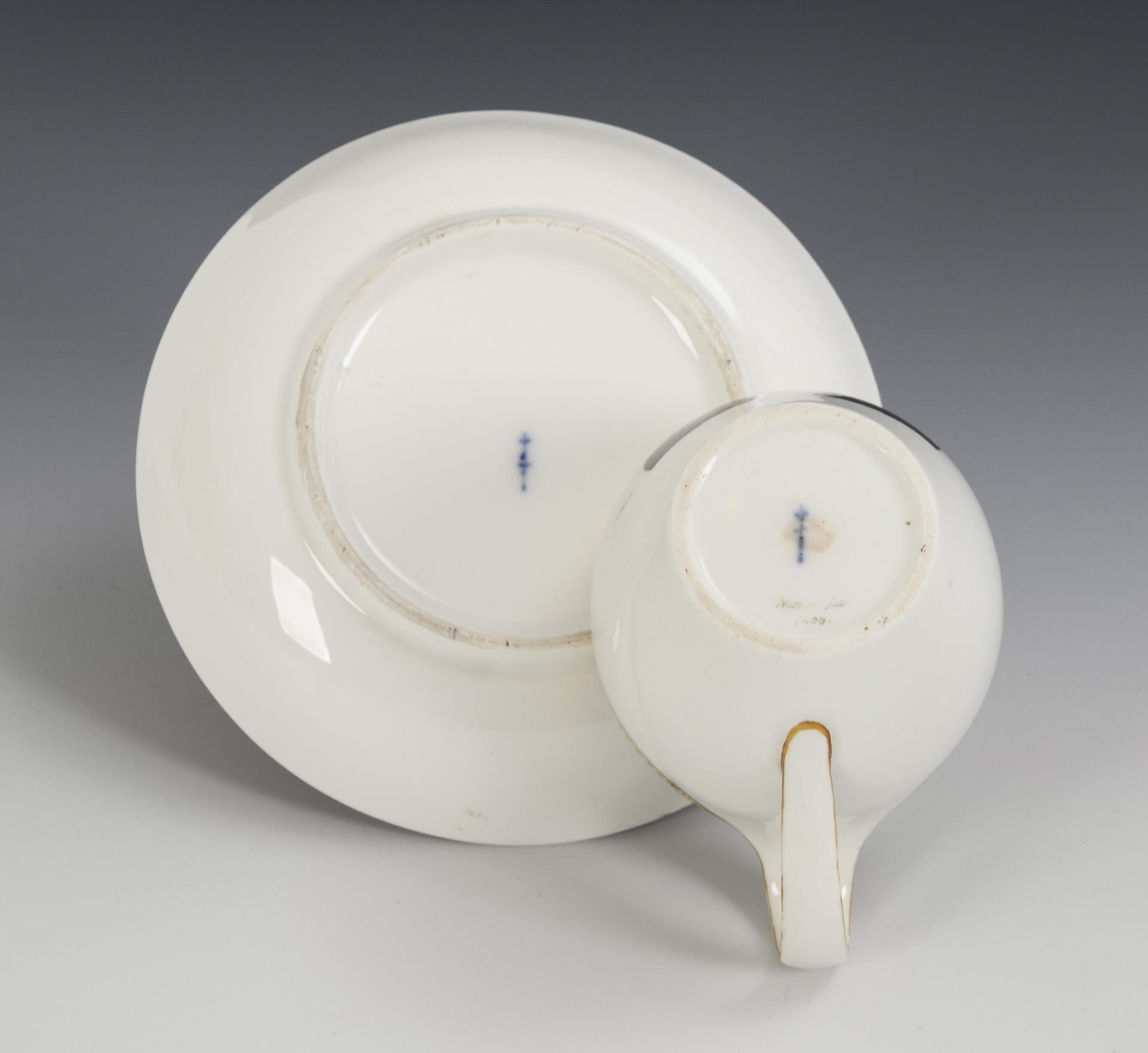 Schwarzlotmalerei, Goldstaffage. Tasse (H 7,5 cm), ergänzte Untertasse (Ø 13,5 cm).