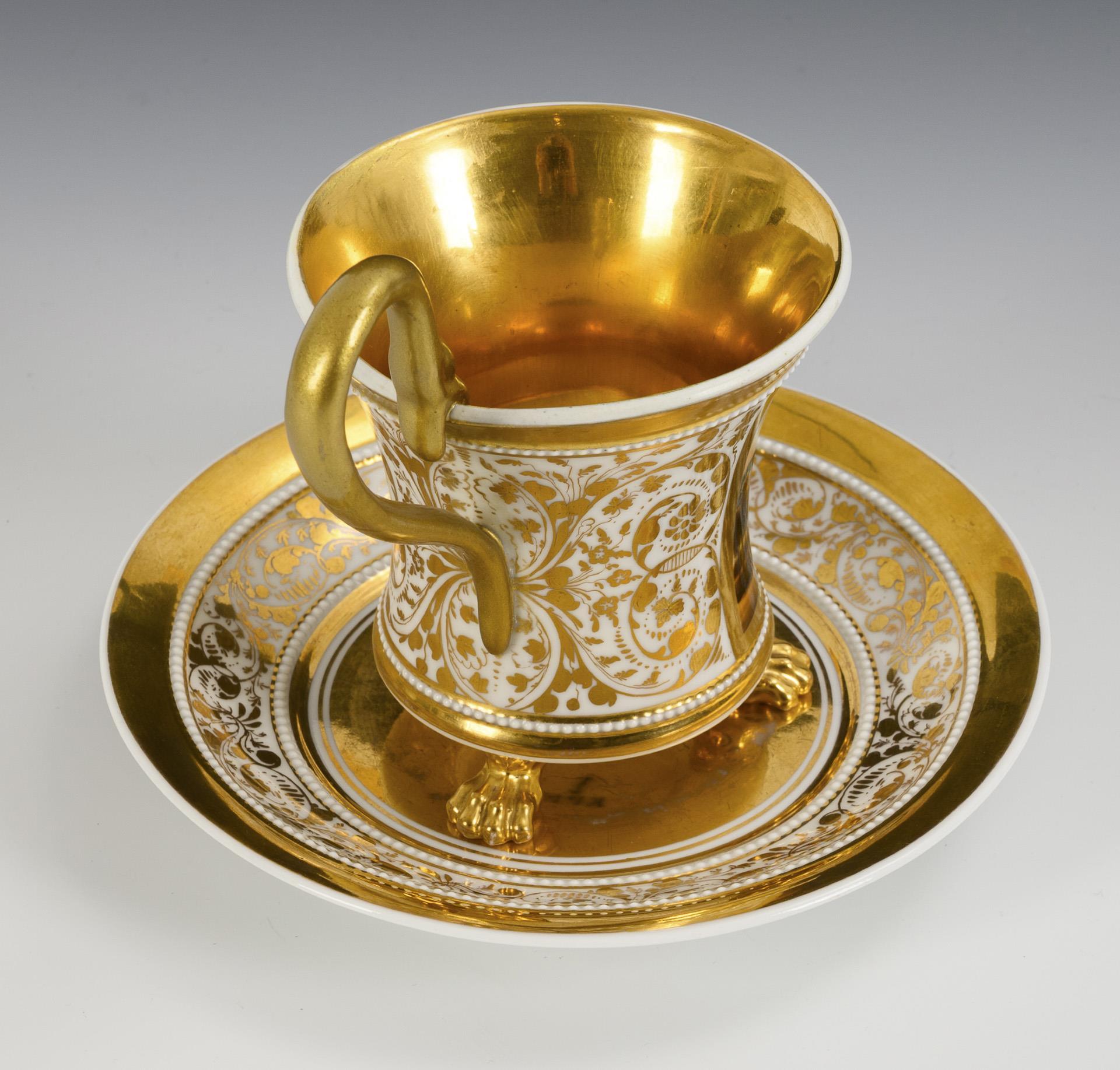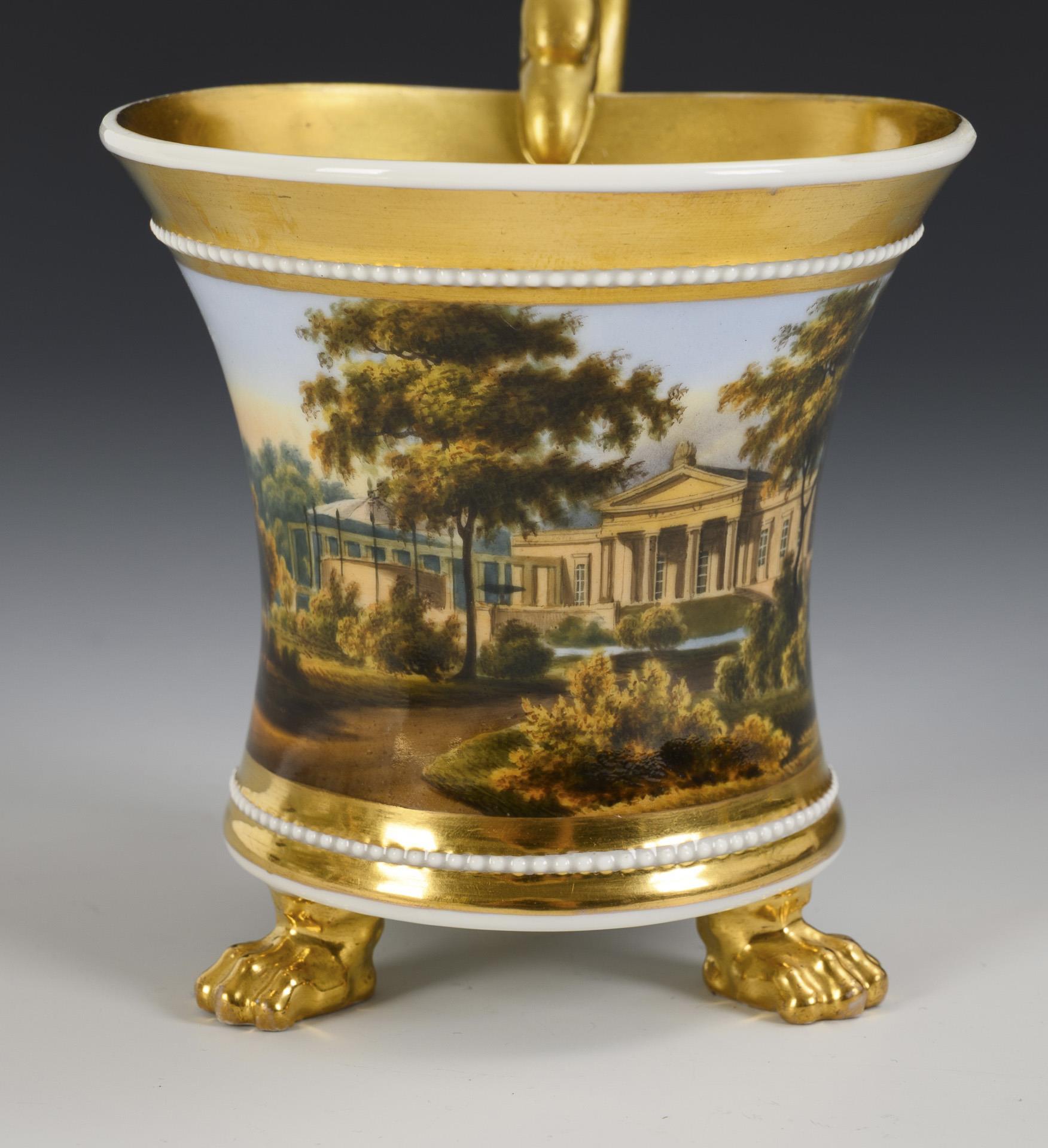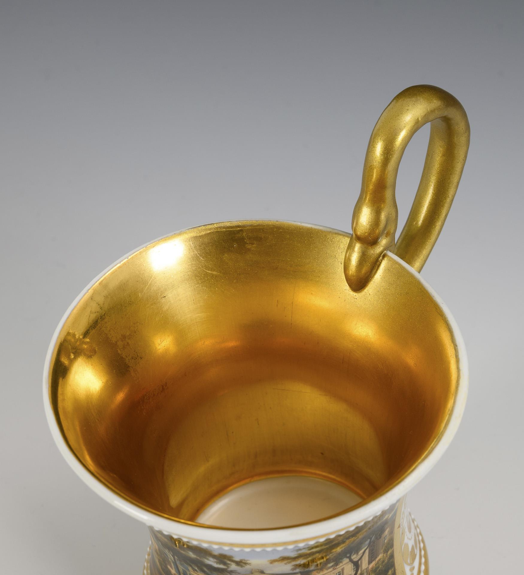 Kratertasse mit Perlbändern, Schwanenhenkel und drei Tatzenfüßen, In einer Rechteckkartusche die unterseitig bezeichnete Ansicht des Charlottenhofes im Park von Sanssouci, verso florale Goldmalerei, innen vergoldet. Henkel restauriert, dieser und Wandung am oberen Henkelansatz nachvergoldet.