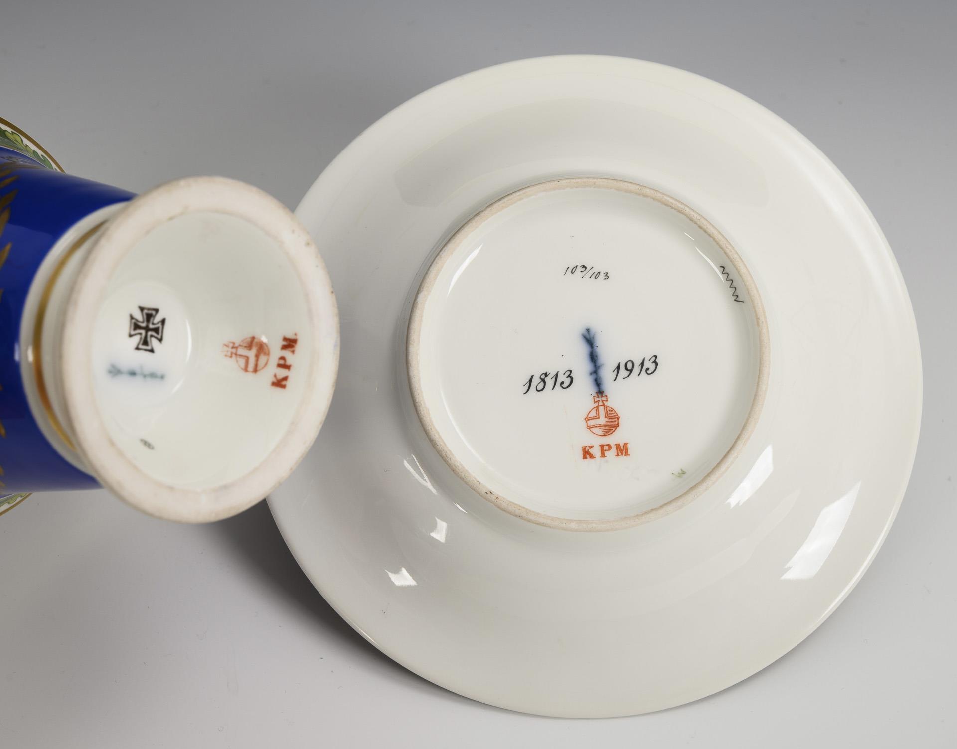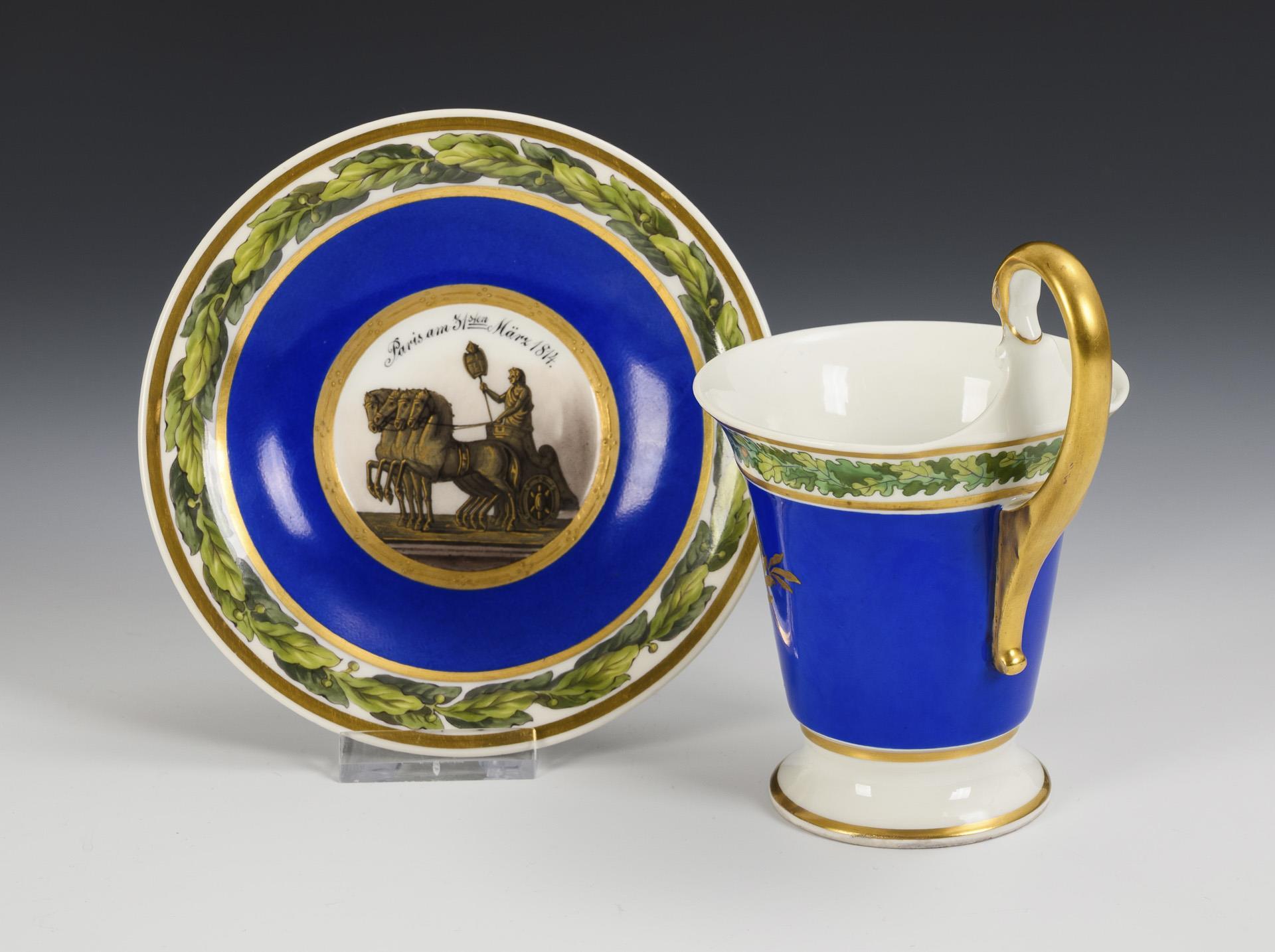 Gefußte Kratertasse mit Schwanenhenkel. Eichenlaubbordüre, blauer Fond sowie schauseitig das Eiserne Kreuz mit der Jahreszahl "1914". Im Spiegel der Untertasse die Darstellung einer Quadriga mit der Bezeichnung "Paris, 3. Maerz, 1814".