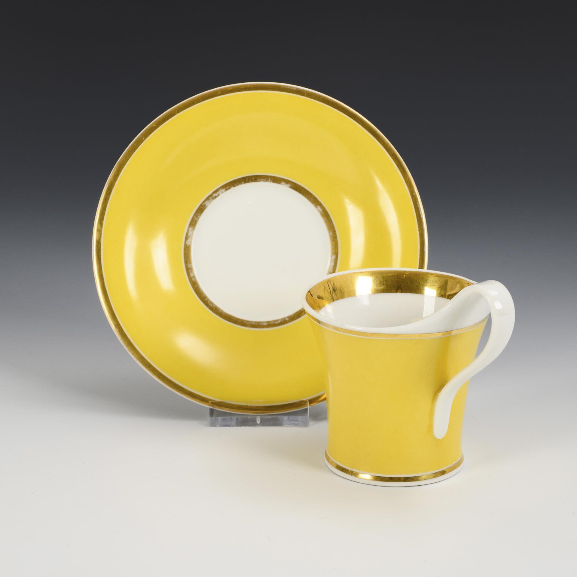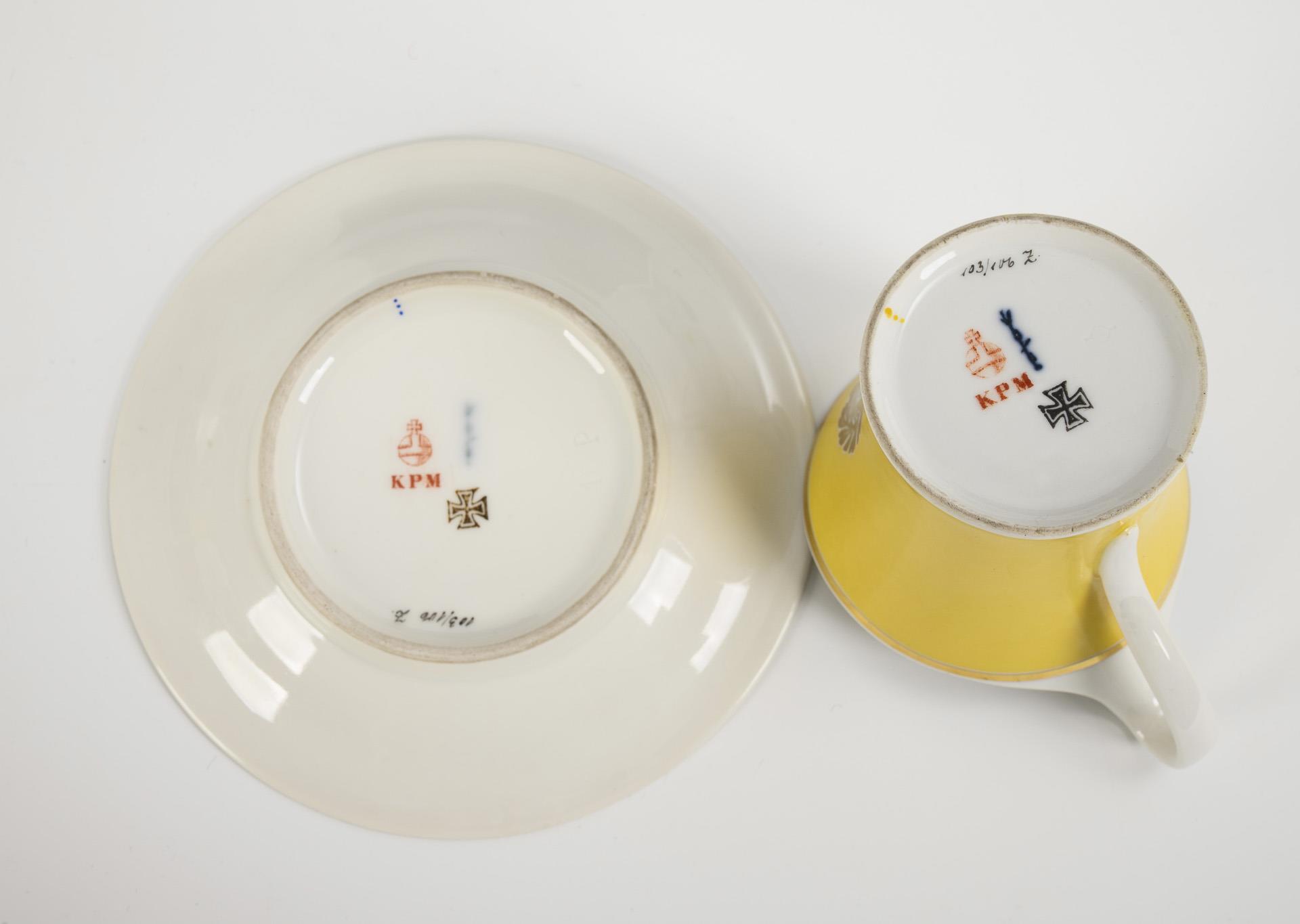 Modell "Konisch" mit Campanerhenkel. Zitronengelber Fond, schauseitig ein Eisernes Kreuz in einem goldenen Lorbeerkranz. Minimaler Goldabrieb an der Untertasse.