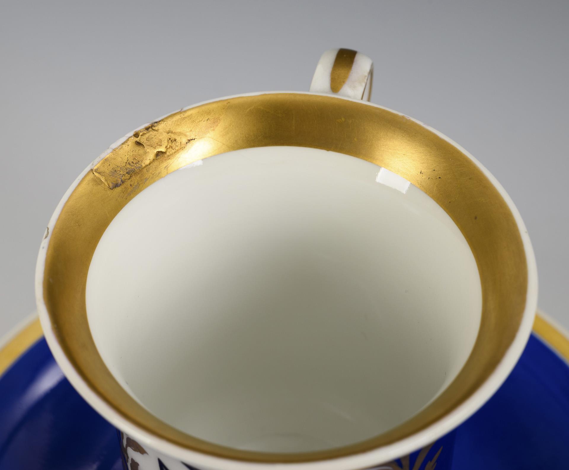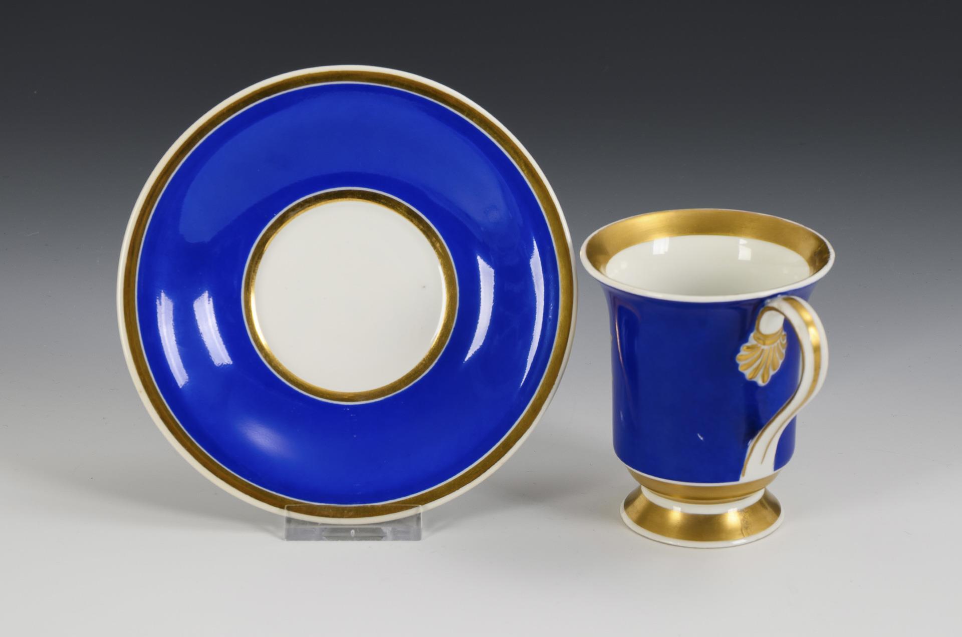 Polychrom bemalt, goldstaffiert. Tasse (H 8,5 cm), ergänzte Untertasse (Ø 14 cm).
