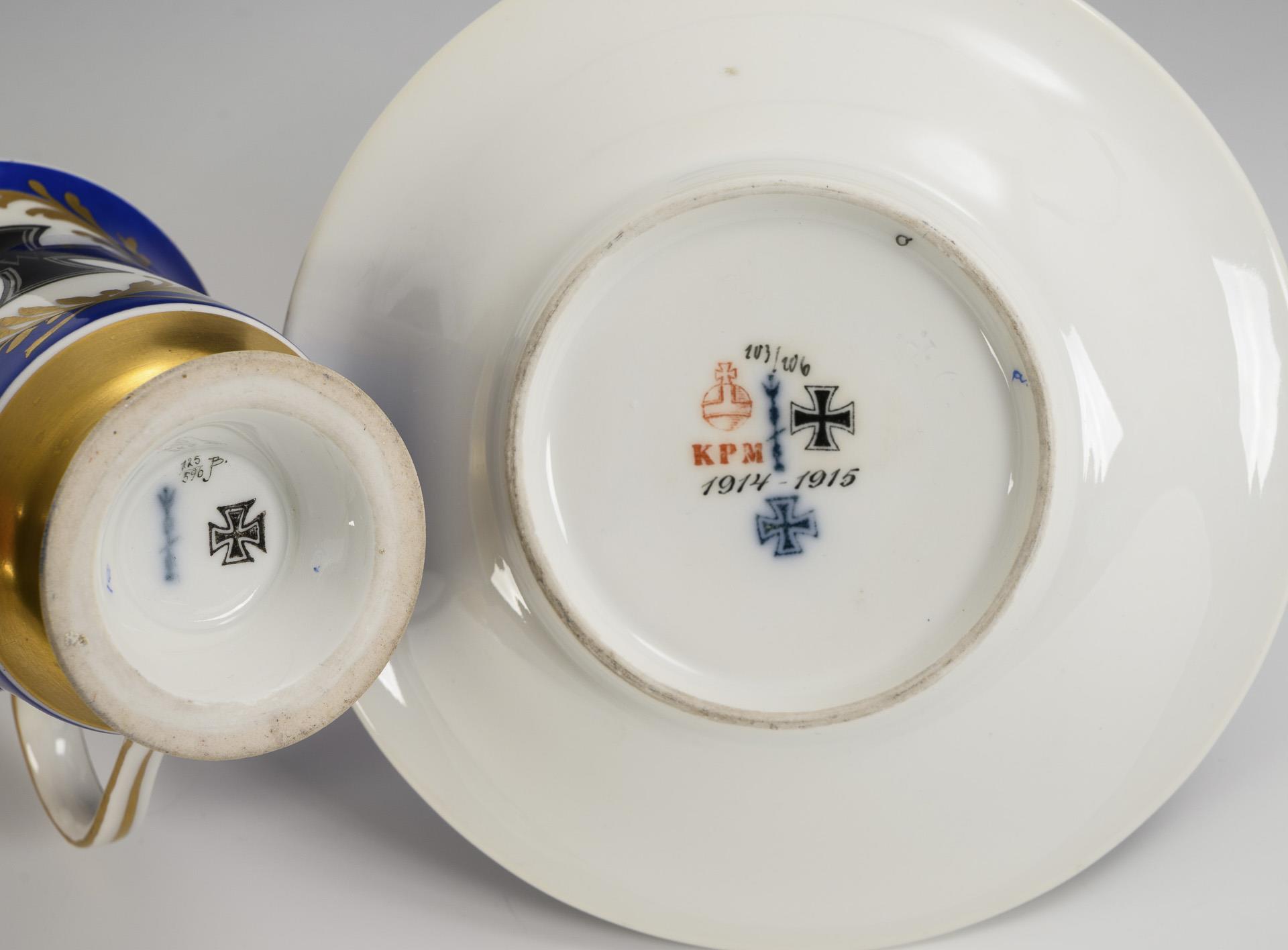 Gefußte Glockentasse mit Ohrenhenkel. Blauer Fond, schauseitig ein palmwedelgerahmtes Medaillon mit dem Eisernem Kreuz 1914. 2 Reparaturen am Mündungsrand der Tasse/.