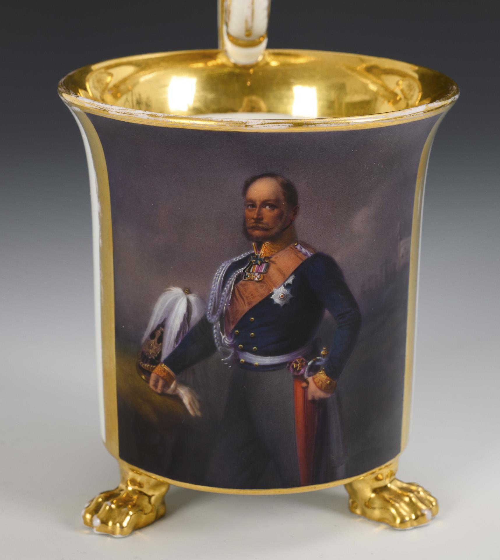 Kratertasse mit Zylinderrand, Rosettenhenkel und drei Tatzenfüßen. Schauseitig in einer Rechteckkartusche das Bildnis Kaiser Wilhelms I.. 1 Tatzenfuß bestoßen, Gold partiell berieben.
