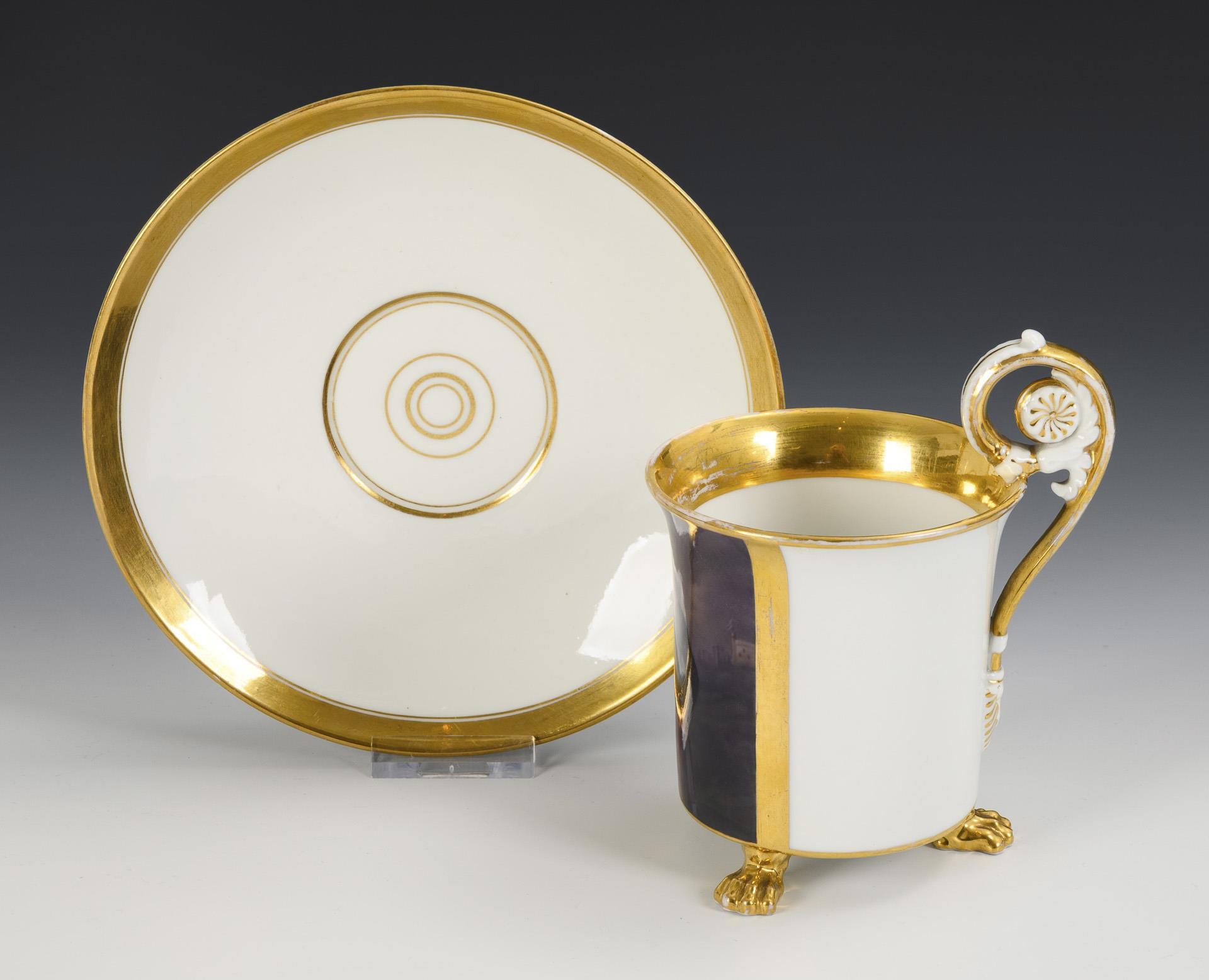 Polychrom bemalt, goldstaffiert. Tasse (H 13,5 cm), ergänzte Untertasse (Ø 17 cm).