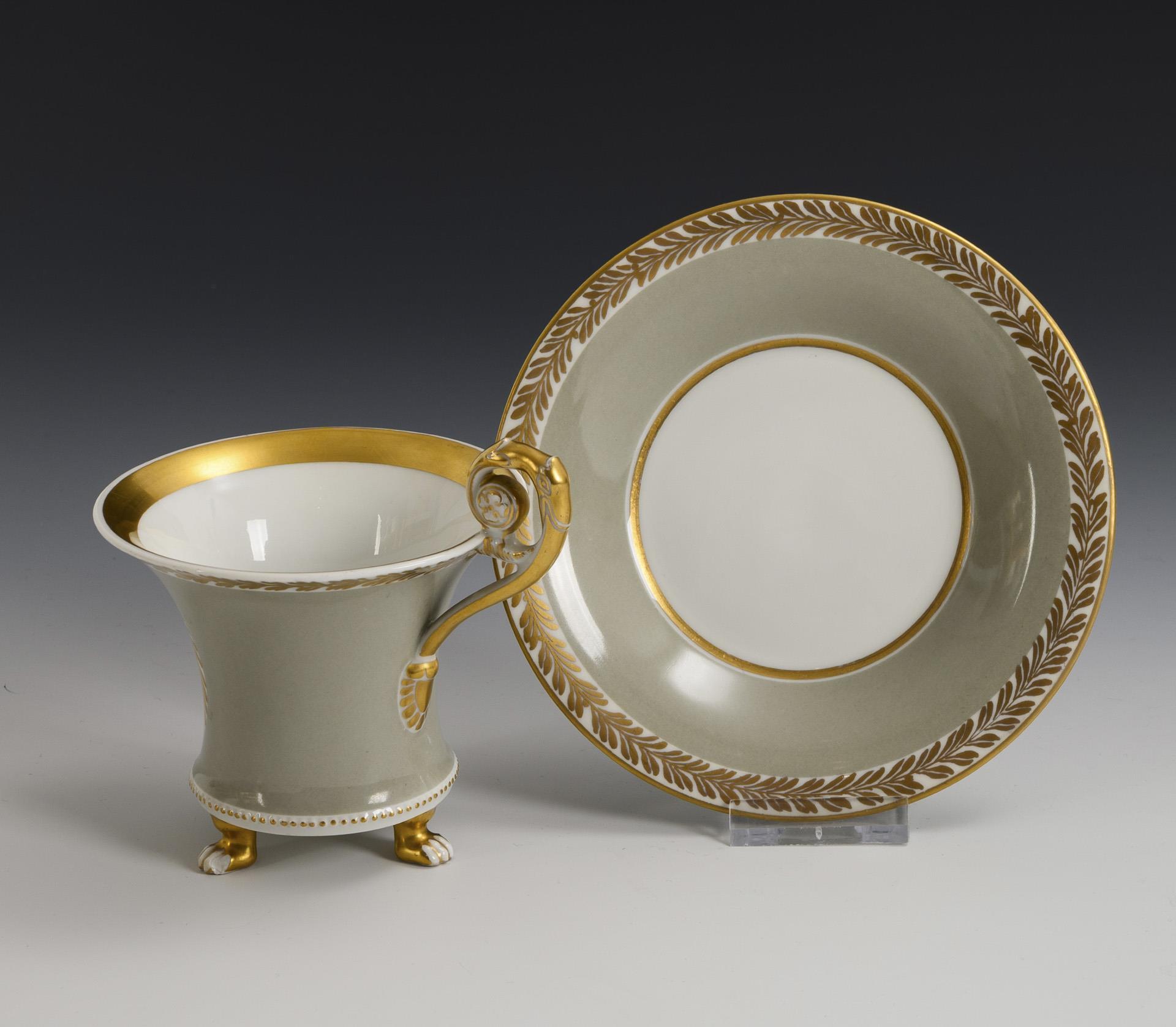 Polychrom bemalt, goldstaffiert. Tasse (H 11 cm), originale Untertasse (Ø 14,5 cm).