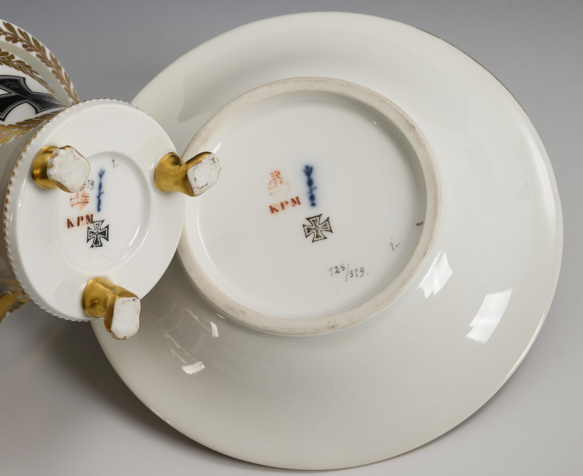 Kratertasse mit Rosettenhenkel und drei Tatzenfüßen. Grauer Fond, in einem lorbeerlaubgerahmten Medaillon das Eiserne Kreuz 1914. 1 Tatzenfuß bestoßen, 1 Tatzenfuß mit goldretuschierter Bestoßung.