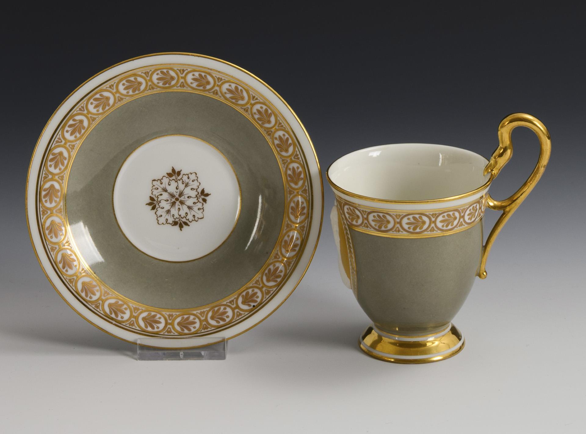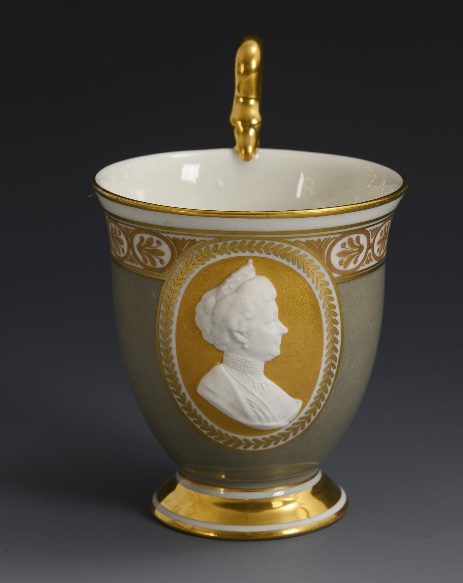 Gefußte Glockentasse mit Schwanenhenkel. Grauer Fond, vegetabile Goldbordüre, schauseitig ein Medaillon mit dem Biskuitporträt der Königin Auguste Viktoria.