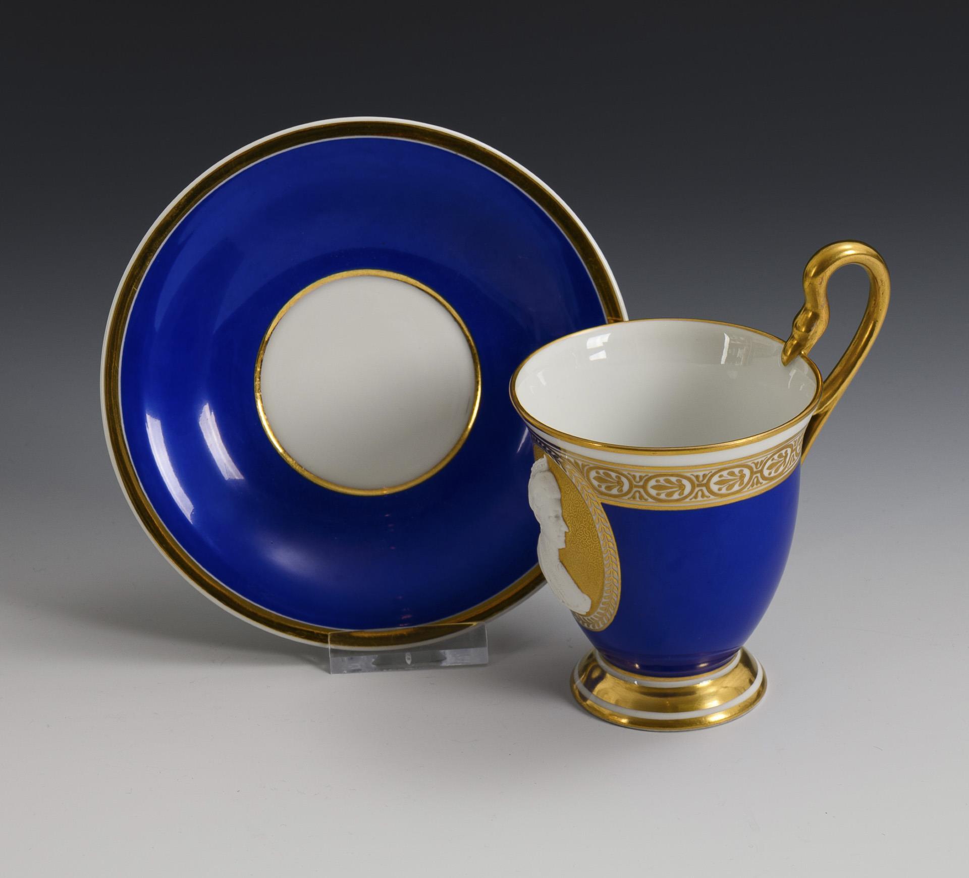 Gefußte Glockentasse mit Schwanenhenkel. Blauer Fond, vegetabile Goldbordüre, schauseitig ein Medaillon mit dem Biskuitporträt der Kaiserin Auguste Viktoria. .