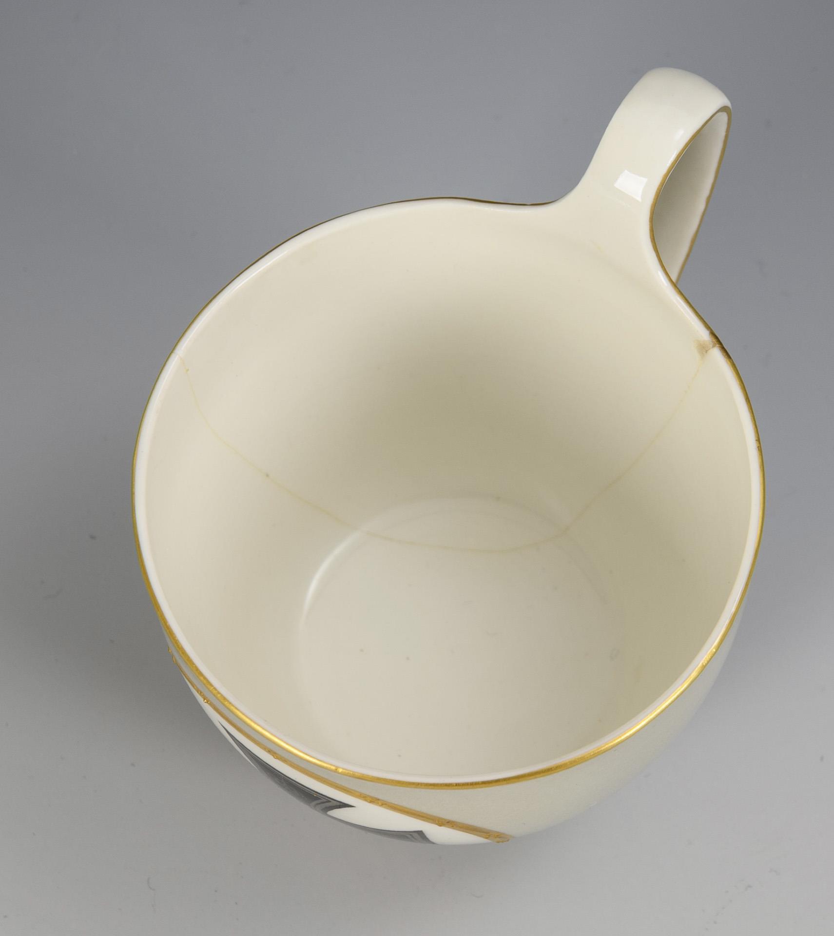 Polychrom bemalt, goldstaffiert. Tasse (H 6,5 cm), originale Untertasse (Ø 11,5 cm).