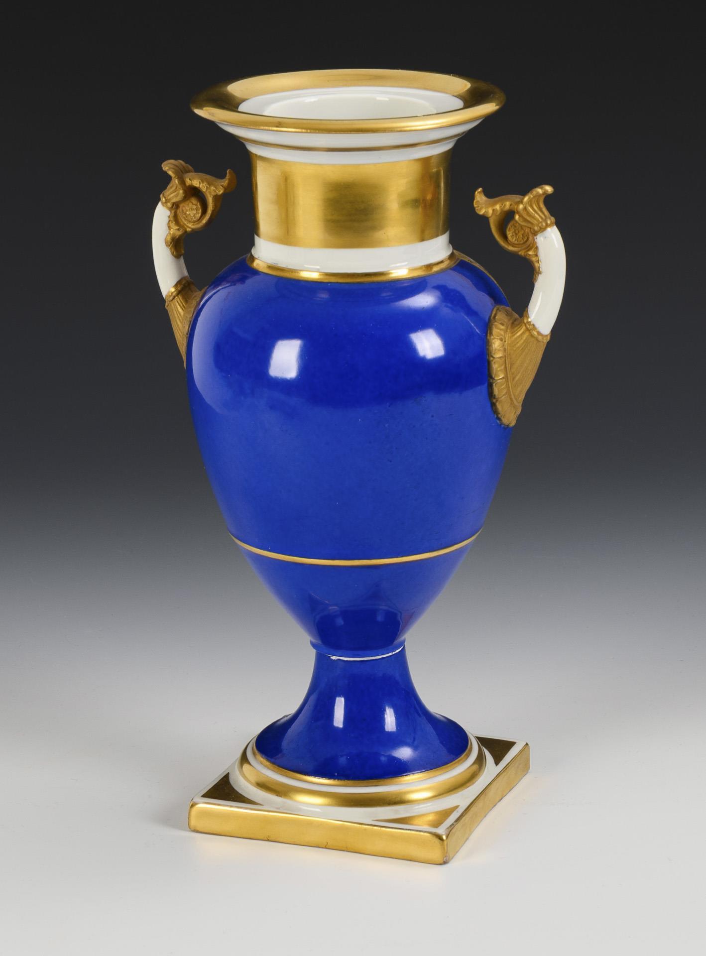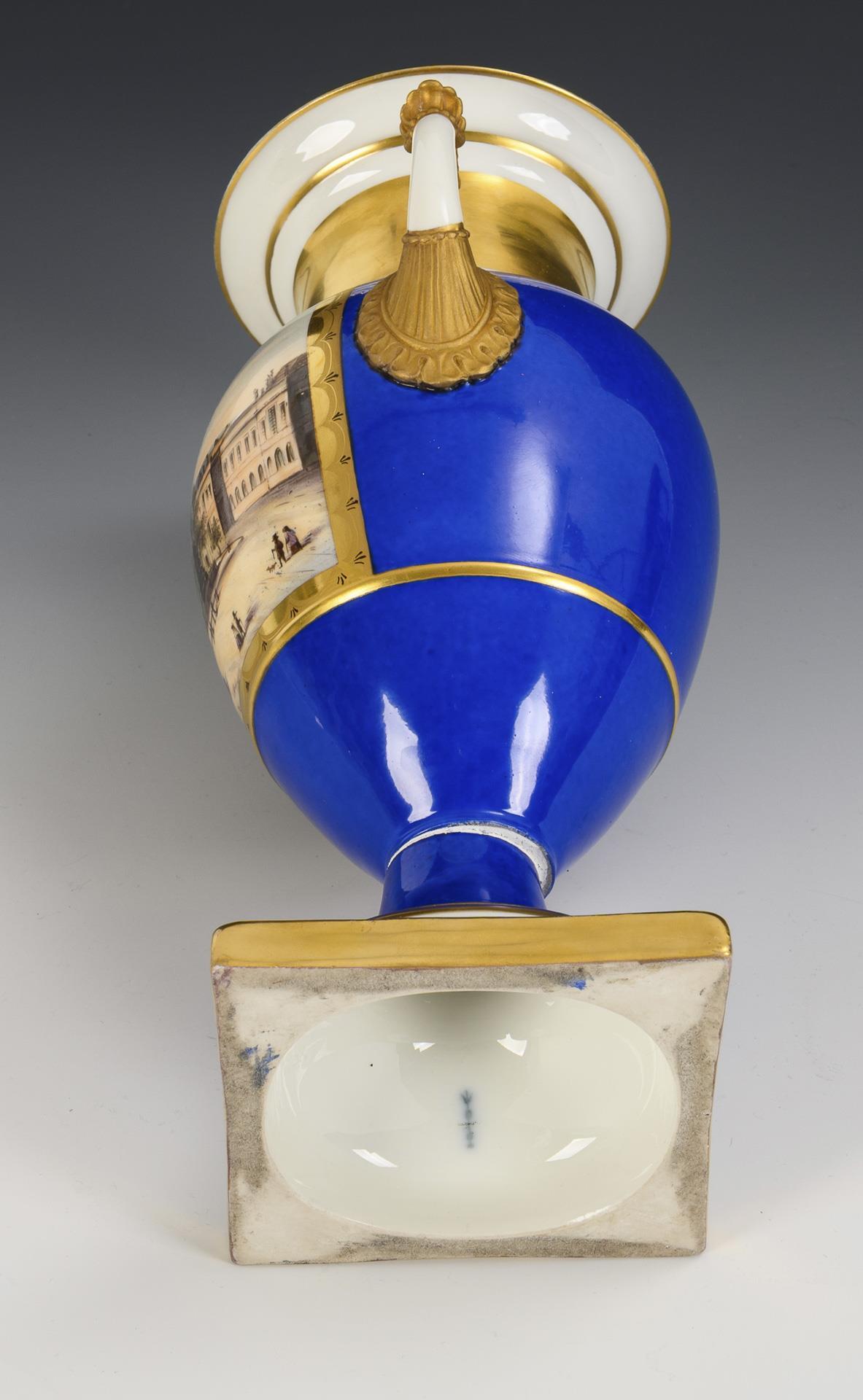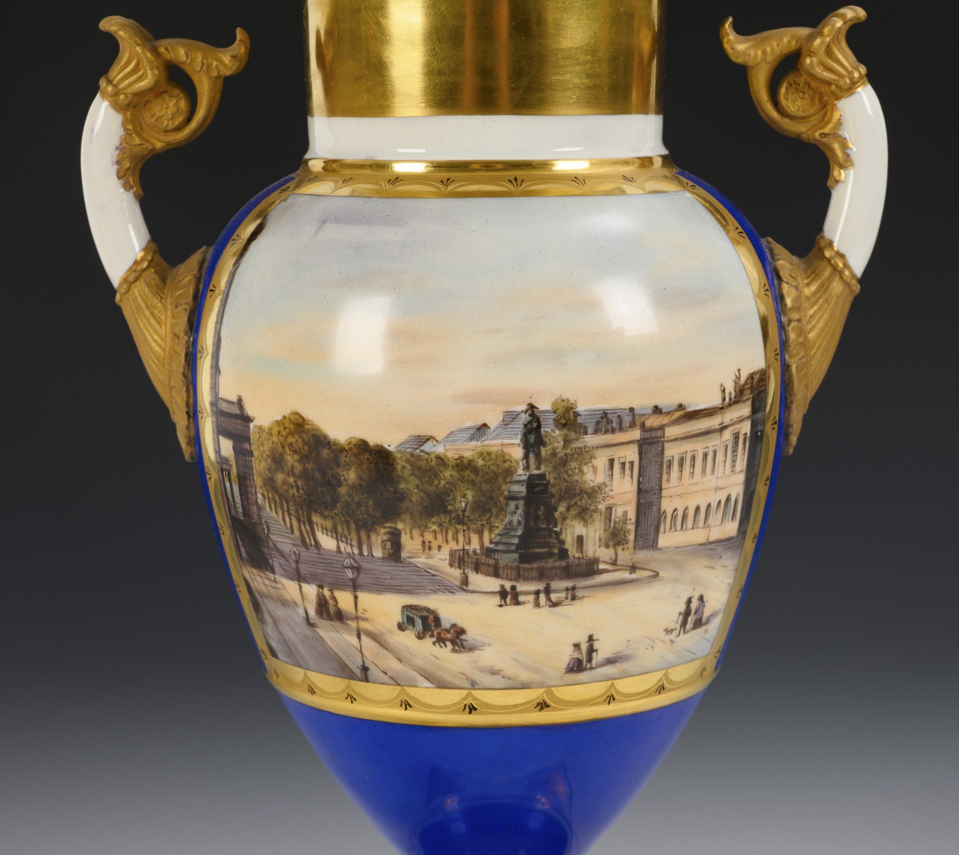 Amphorenvase mit zwei goldbronzierten Rosettenhandhaben, Zylinderhals, Kraterrand und Rundfuß, auf Quadratplinthe. Königsblauer Fond, schauseitig eine Rechteckkartusche Blick auf das bedeutende Monument am Forum Friedericianum (Berlin Mitte am Anfang der Prachtstraße "Unter den Linden").