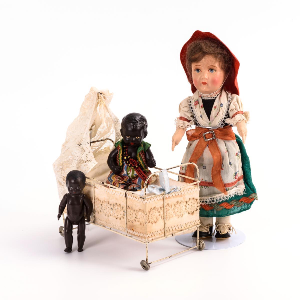 Weiß lackiertes Metallbettchen mit Himmel. Dazu Neustädter Trachtenpuppe, schwarzes Schildkröt-Baby und schwarzes Keramikbaby. 1 Baby unbekleidet. Altersspuren, Lackdefekte.