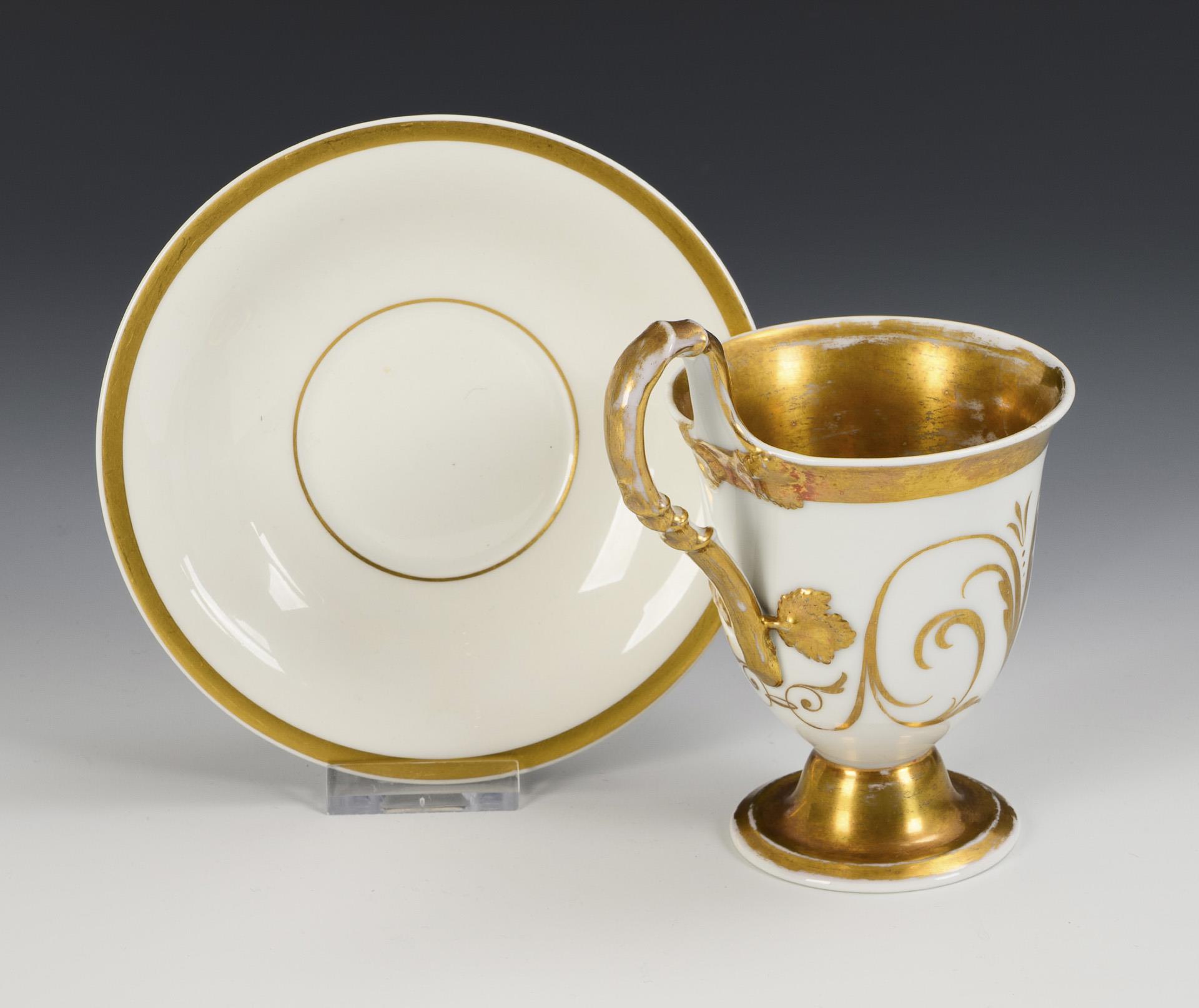 Polychrom bemalt, goldstaffiert. Tasse (H 13,5 cm), ergänzte Untertasse (Ø 14,5 m).