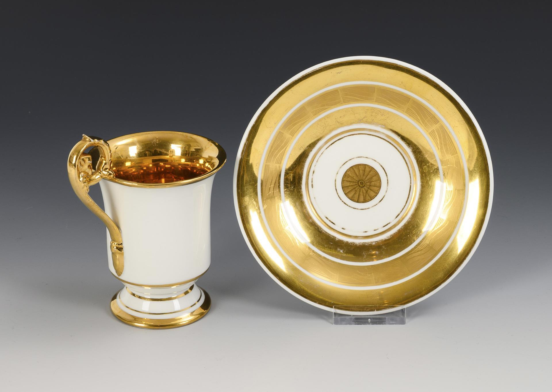 Polychrom bemalt, goldstaffiert. Tasse (H 12 cm), ergänzte Untertasse (Ø 15 cm).