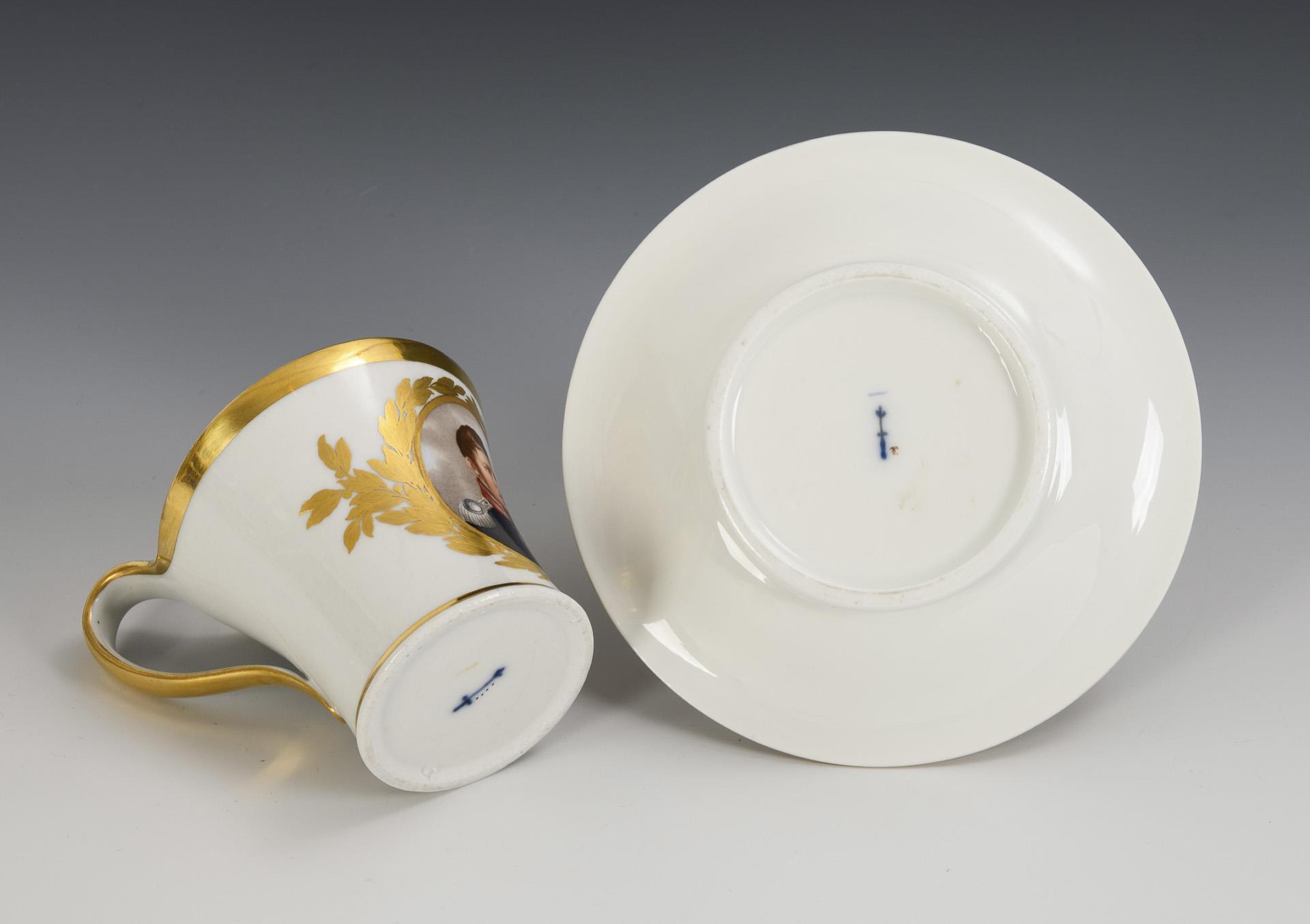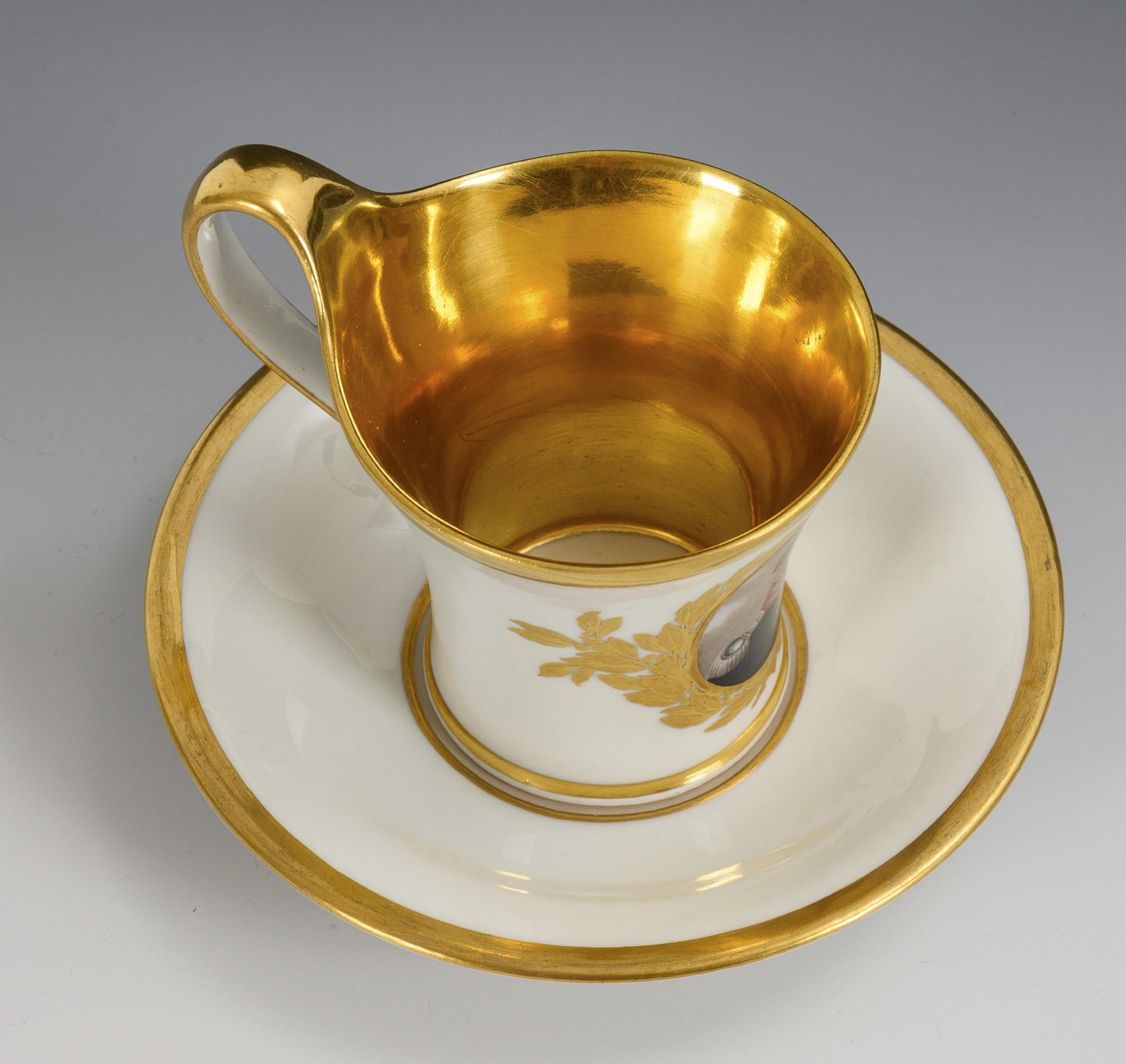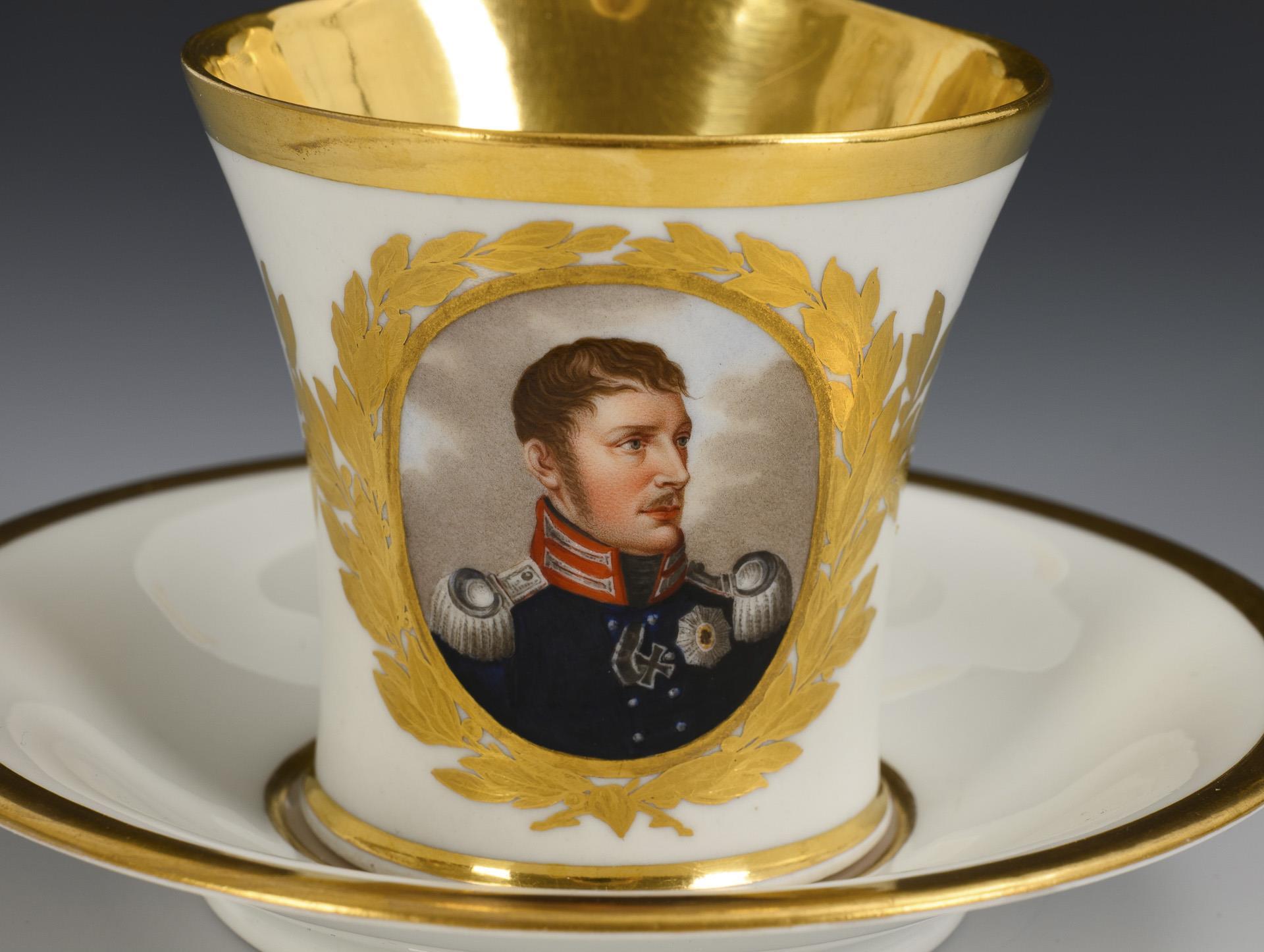 Modell "Konisch" mit Campanerhenkel. Schauseitig ein von goldreliefgemalten Lorbeerzweigen gerahmtes Medaillon mit dem Bildnis des preußischen Königs Friedrich Wilhelm III. (1770-1840), innen vergoldet. Im Spiegel der Untertasse bezeichnet.