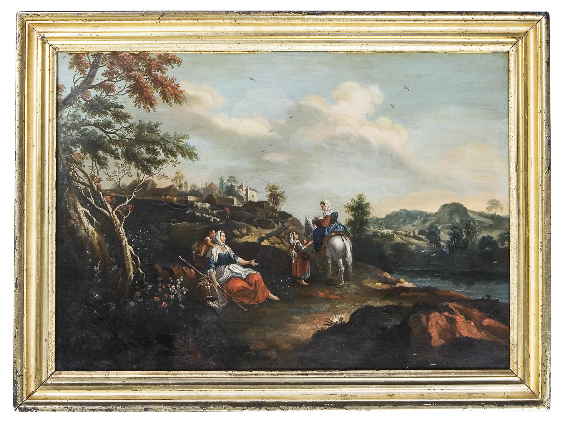 Genreszene in großflächiger, detailreich sich weit in die Tiefe erstreckender Hügellandschaft im Stil der niederländischen Landschaftsmalerei eines Nicolaes Pietersz Berchem (1620 Haarlem - 1683 Amsterdam). Rückseitig nummeriert, profilierter Waschgoldrahmen.