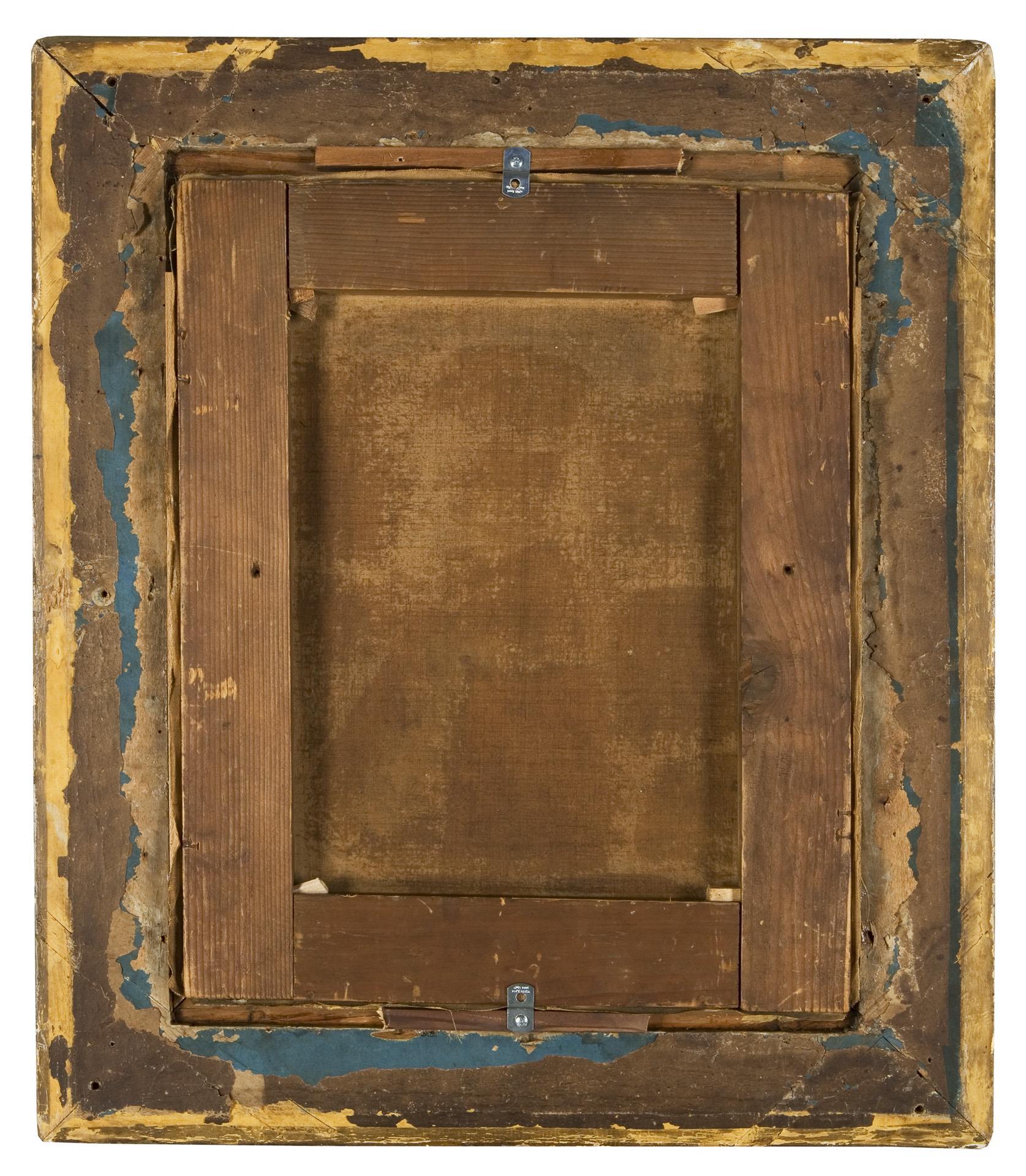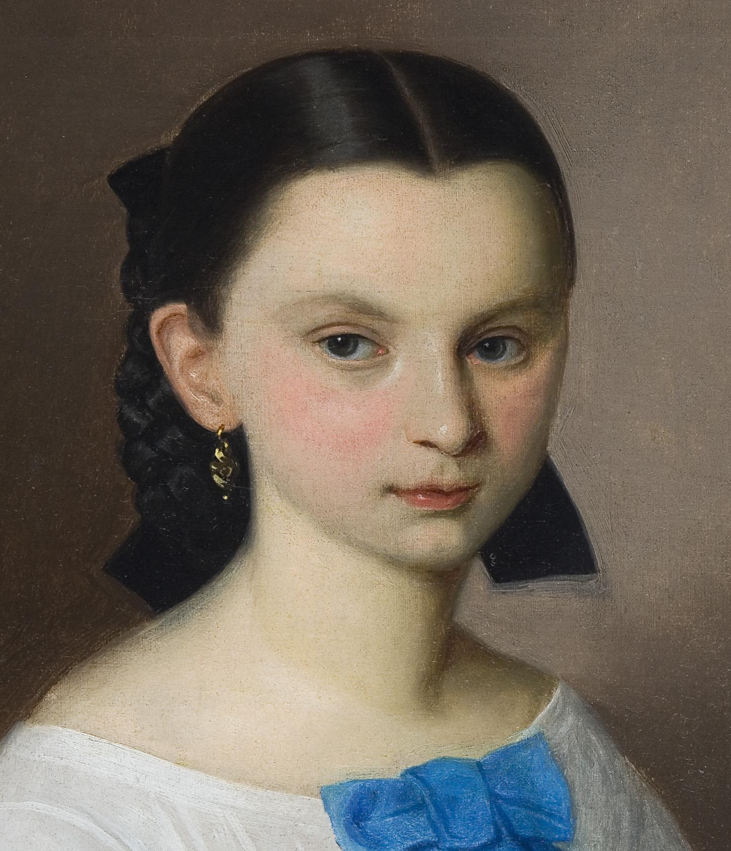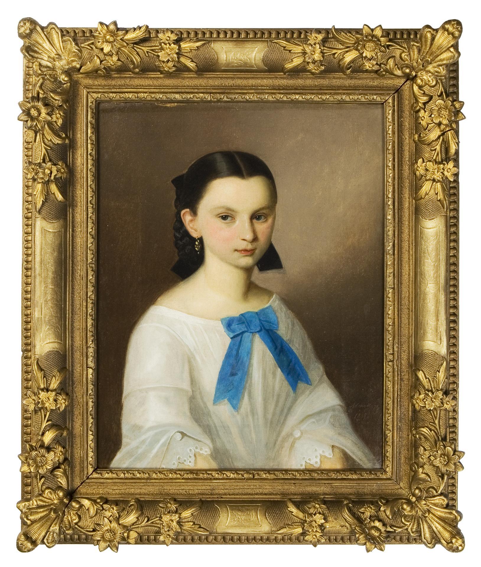 Bürgerlich schlicht mit leicht geröteten Wangen und typischer Frisur ihrer Zeit präsentiert sich hier das junge Mädchen mit sentimental wirkenden Blick. Vergoldeter Stuckrahmen mit plastischen Blütenzweigen.