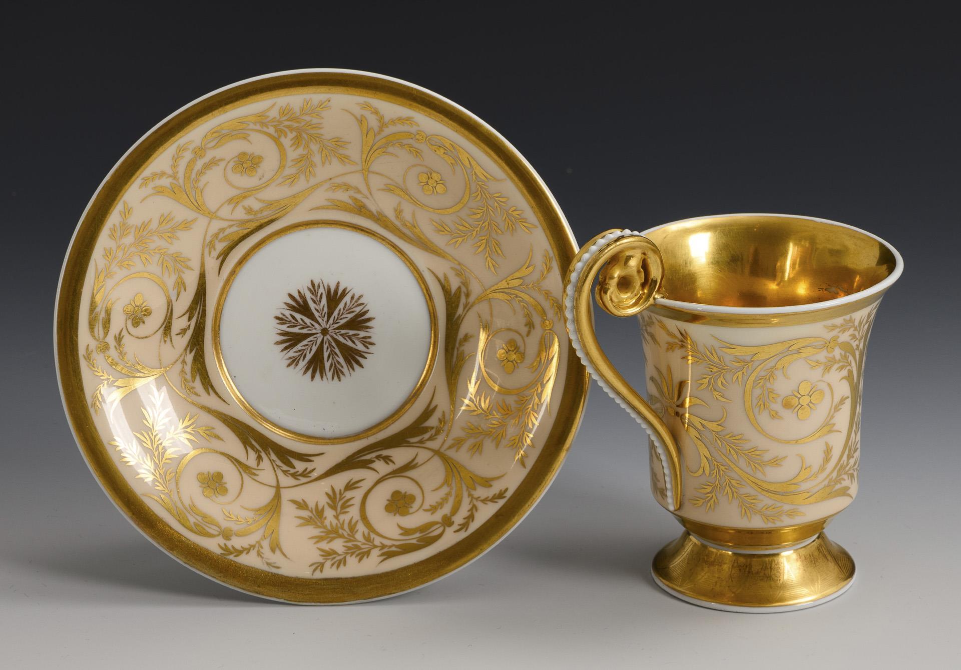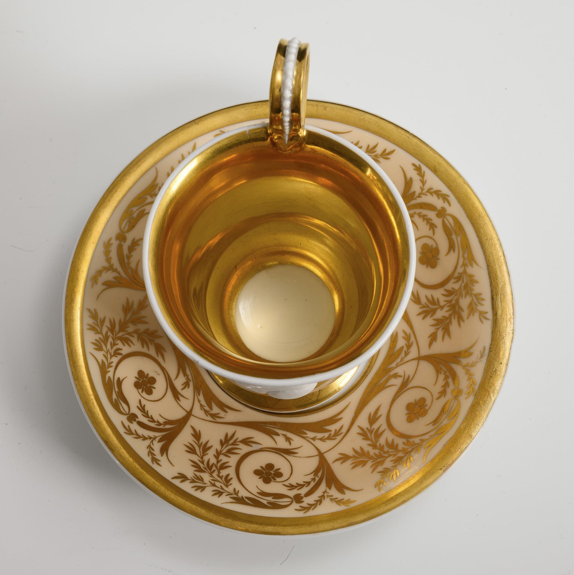 Gefußte Glockentasse mit Perlbandhenkel. Beigefarbener Fond mit reicher floraler Goldmalerei, schauseitig ein Ovalmedaillon mit dem Biskuitreliefbildnis eines Herren, innen vergoldet. Untertassenrand restauriert, unterseitiger Chip am Fuß der Tasse.