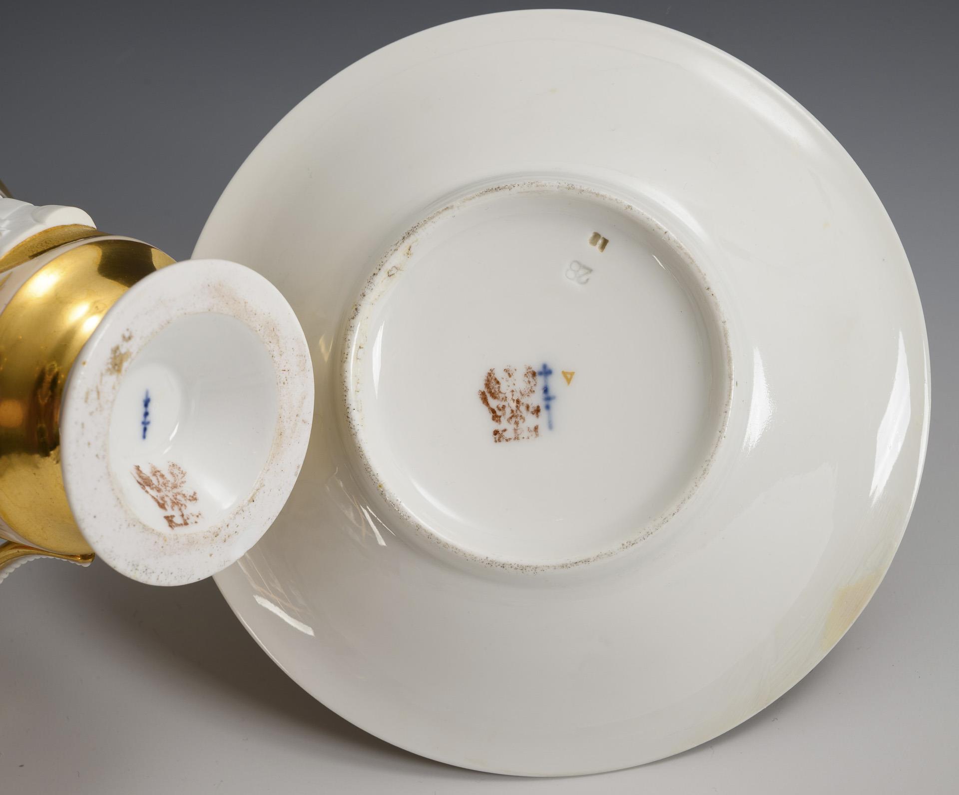 Polychrom bemalt, goldstaffiert. Tasse (H 11,5 cm), originale Untertasse (Ø 15 cm).