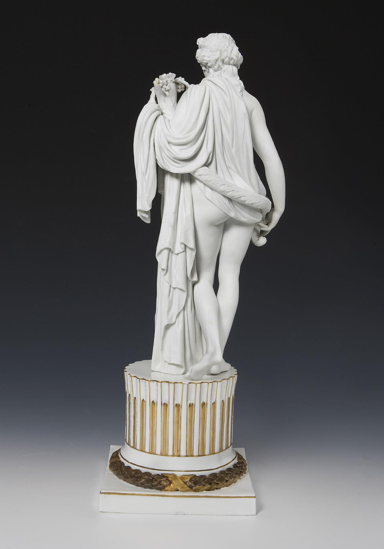Modell von Christian Gottfried Jüchtzer und Mitarbeiter. Fortuna ist die Glücks- und Schicksalsgöttin der römischen Mythologie. Weißporzellan und Biskuitporzellan, das montierte Postament gold staffiert. Goldene Malermarke, Schwertermarke mit Stern. Postament minimal restauriert, mit kleinen Brandrissen, Füllhornrand, Blättchen Trauben leicht bestoßen, Finger einer Hand, ein Fuß, Gewandsaum partiell restauriert.