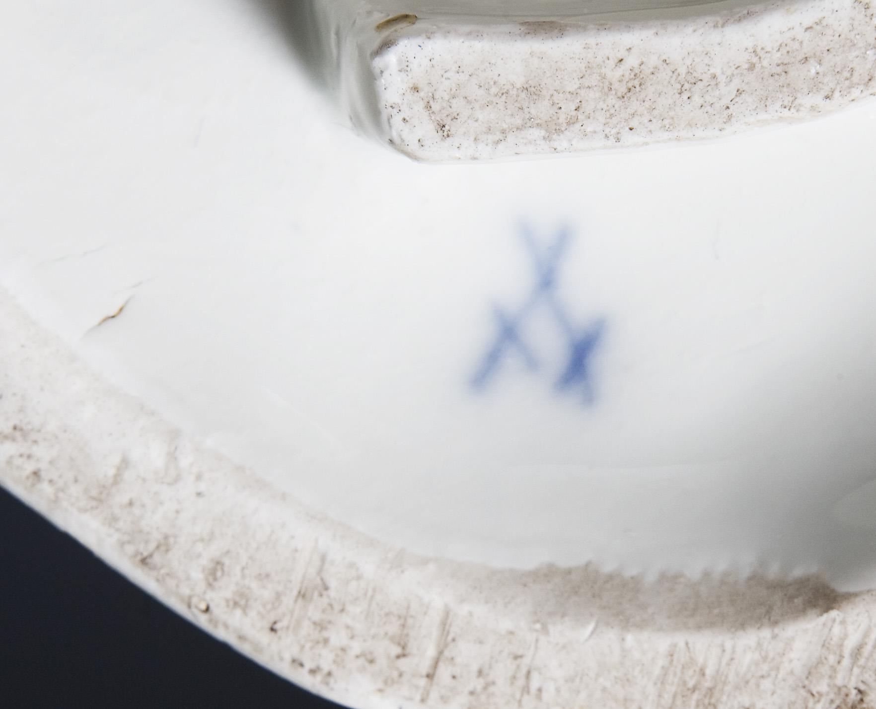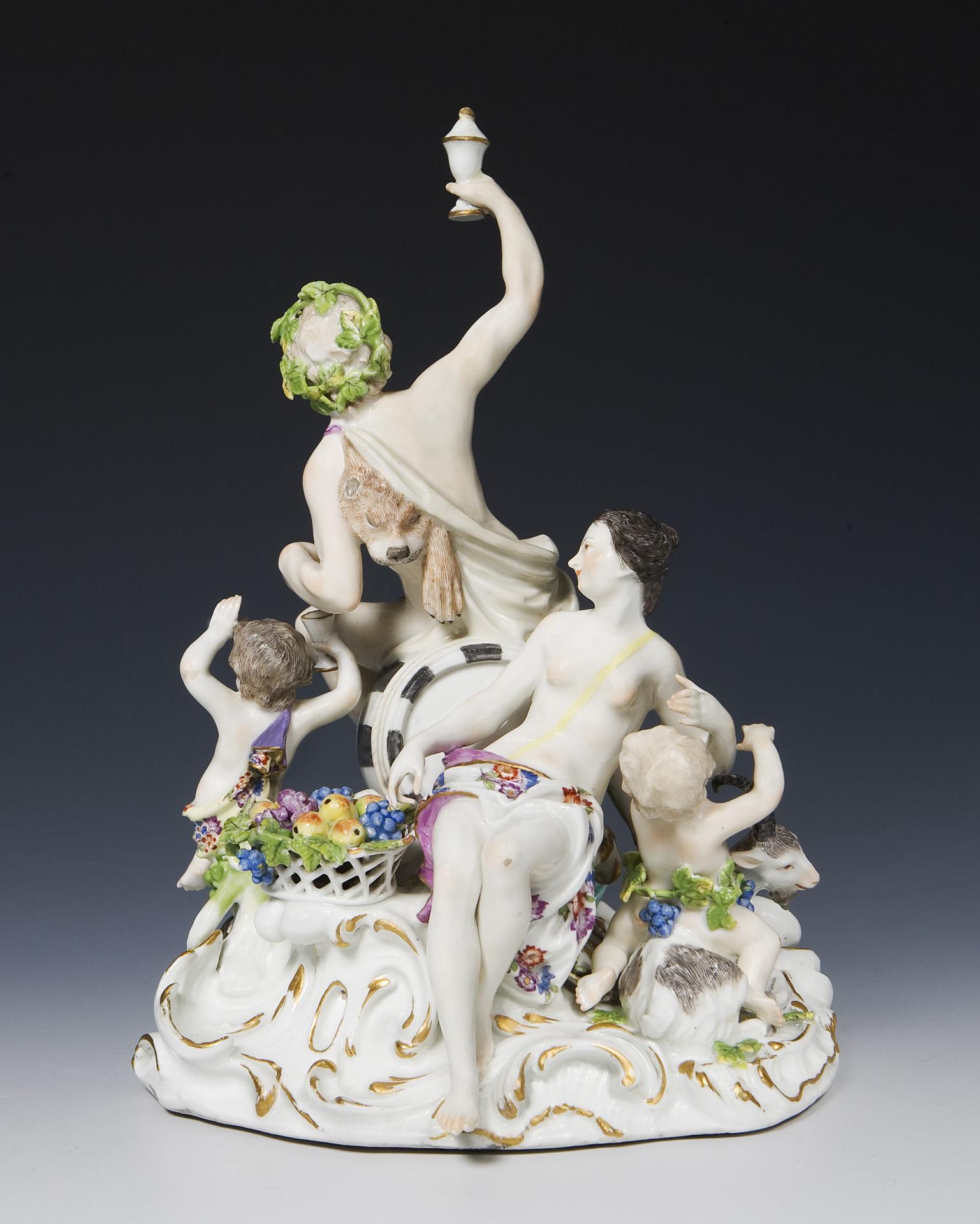 Modell von Johann Joachim Kaendler und Friedrich Elias Meyer. Farbig bemalt, gold staffiert, Schwertermarke. Glasurdefekt von unten am Sockelrand, vier Arme, zwei Beine, einige Blättchen, eine Weinflasche restauriert, wenige Blättchen bestoßen.