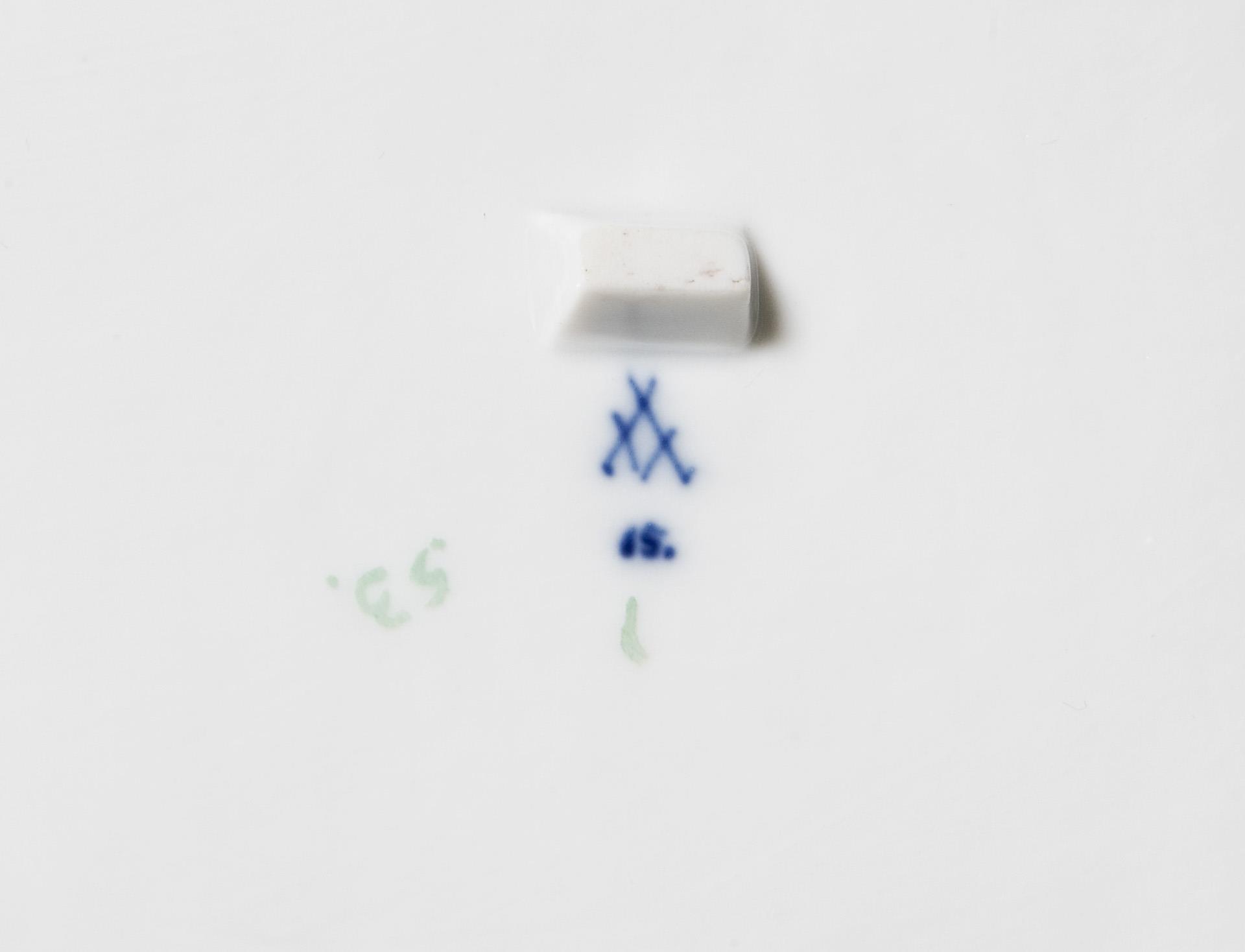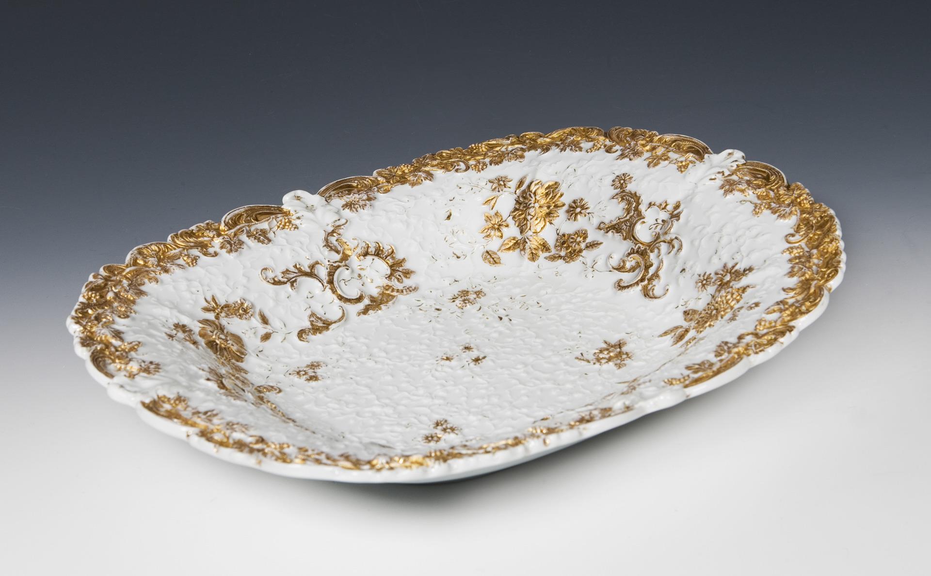Modell von Carl Gotthelf Habenicht und Mitarbeiter. Floral und ornamental reliefiert, gold staffiert. Dekor mit Blüten, Ranken, Rocaillen, Trauben und Weinlaub. Ritzmarke, Pressmarke, Malermarke, Schwertermarke. Gold partiell berieben.