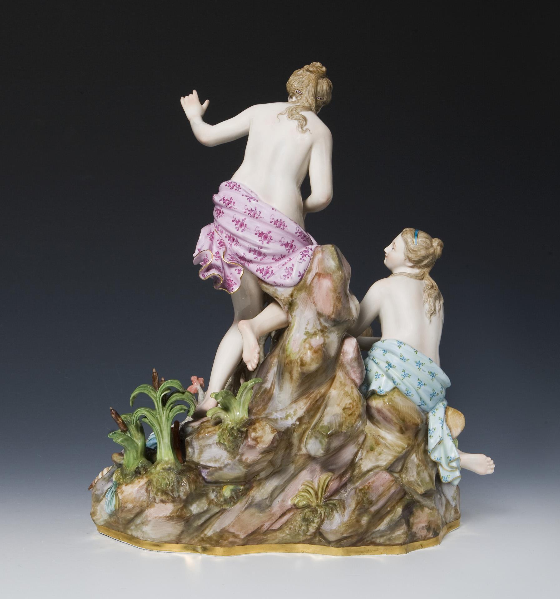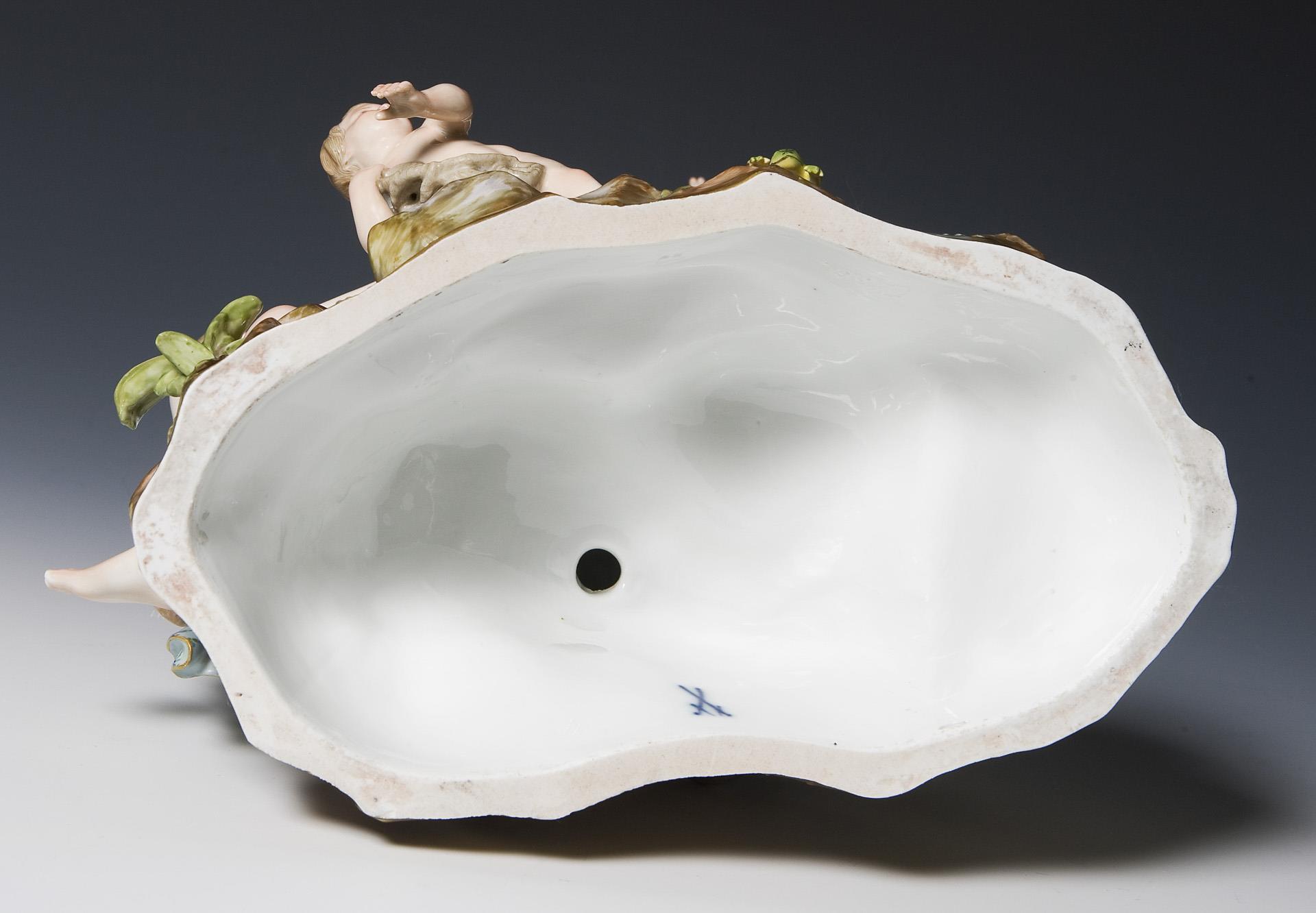 Pendant zu Modell-Nr. C 35 x "Bacchusgruppe", farbig bemalt, gold staffiert. Ritzmarke, Pressmarke, Schwertermarke. Frosch, eine kleine Wasserecke, ein Unterarm mit Hand restauriert, ein kleiner Brandriss.