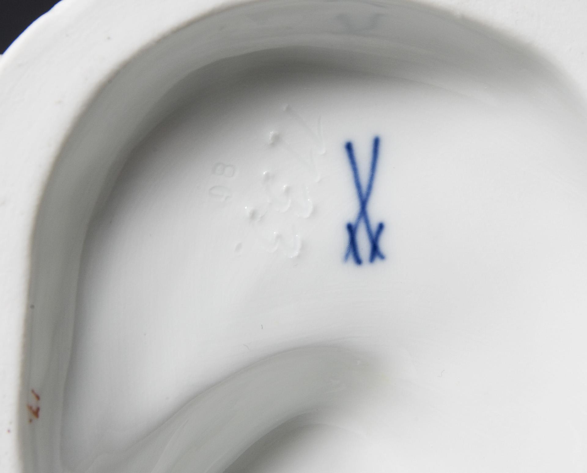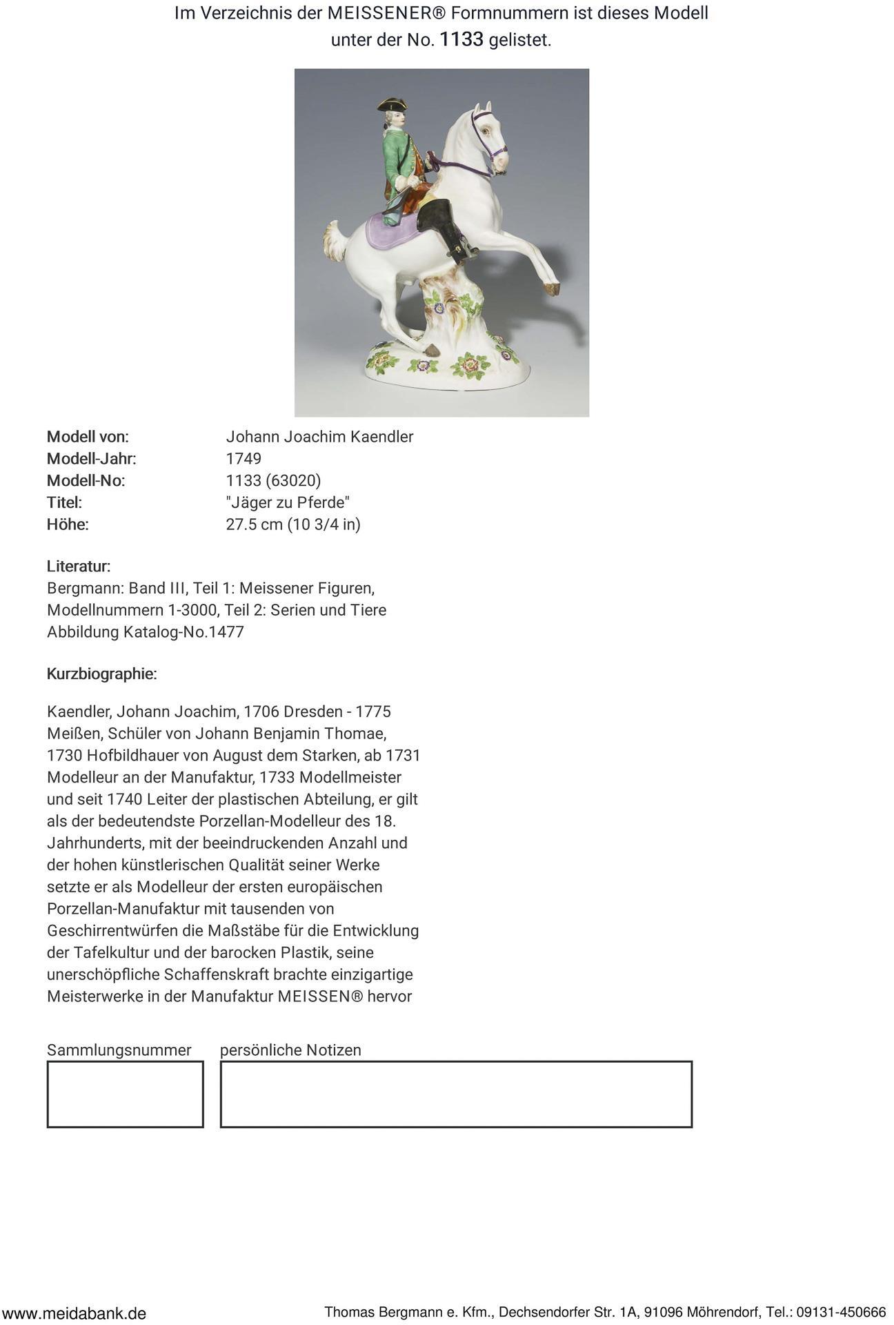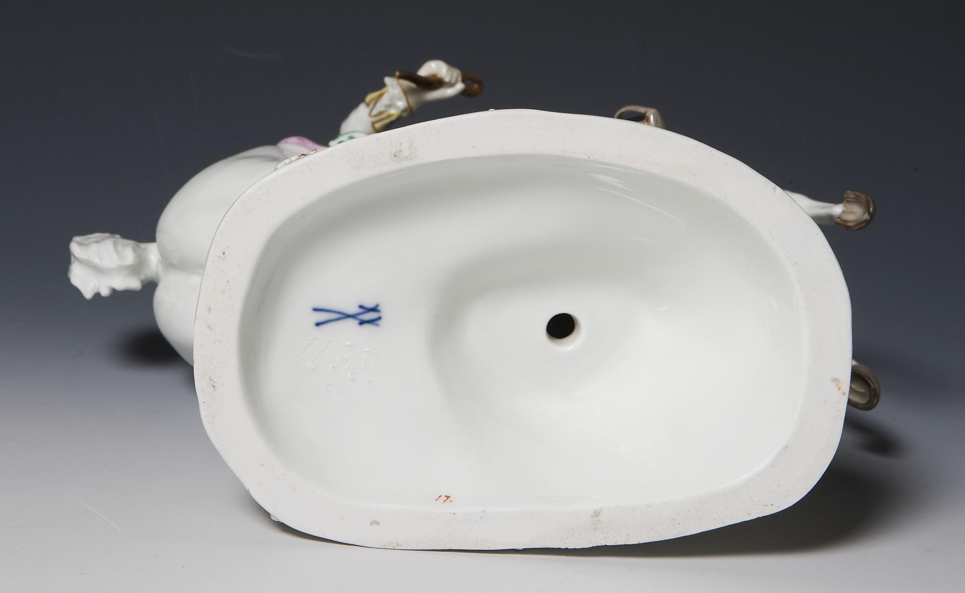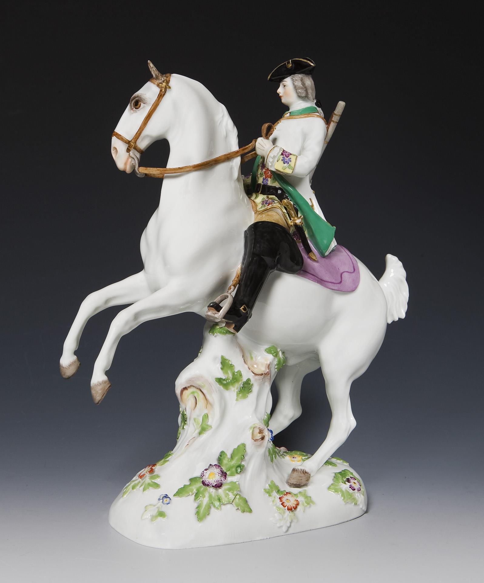 Farbig bemalt, gold staffiert. Ritzmarke, Pressmarke, Malermarke, Schwertermarke. Im Sockel kleiner Glasurdefekt, Gerte, Ohren, Zügelschlaufe, oberer Gewehrkolben restauriert, ein Blatt bestoßen.