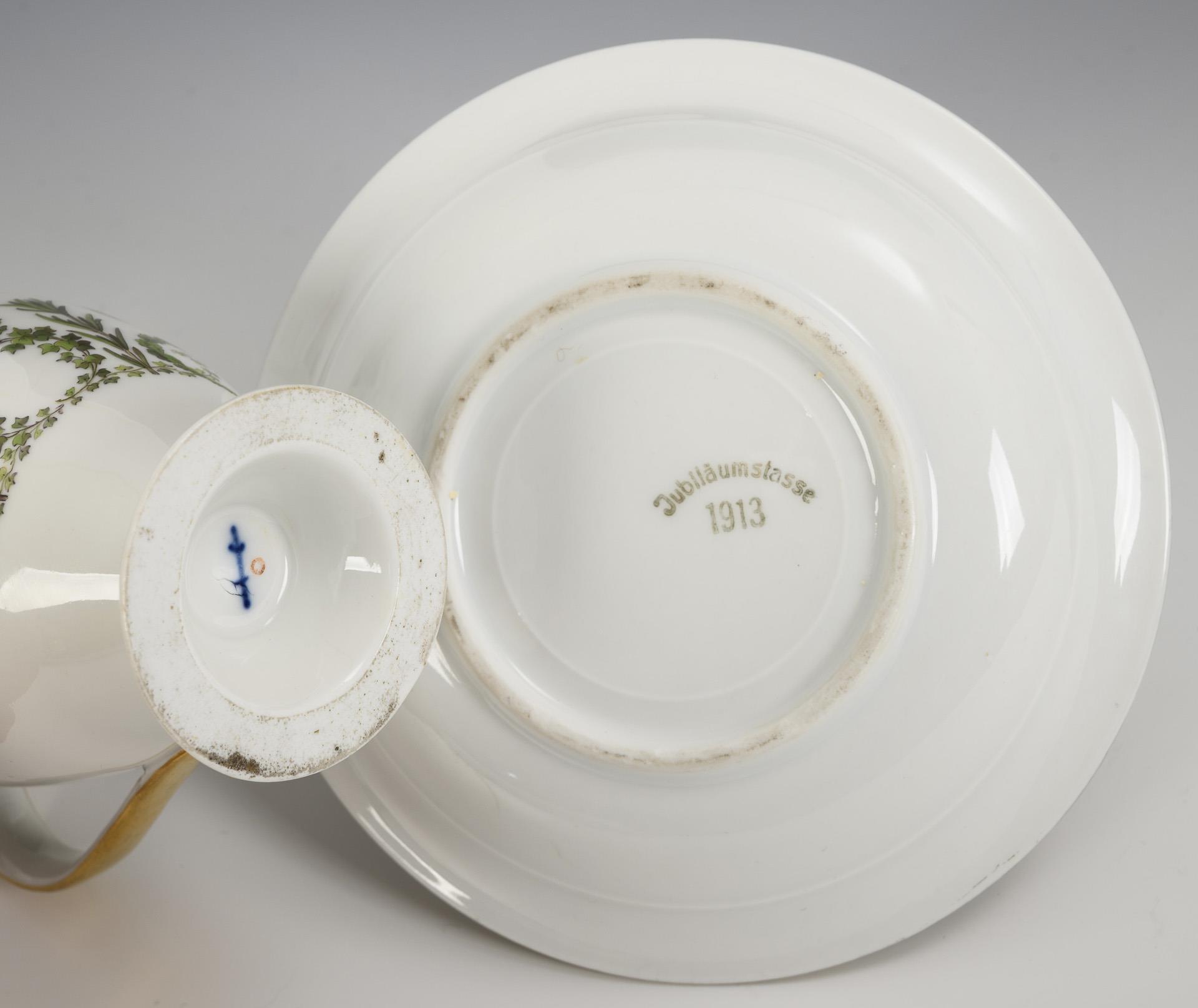 Polychrom bemalt, goldstaffiert (Tasse), polychromes Dekorbild, Goldstaffage (Untertasse). Tasse (H 10,5 cm), Untertasse (Ø 14,5 cm).