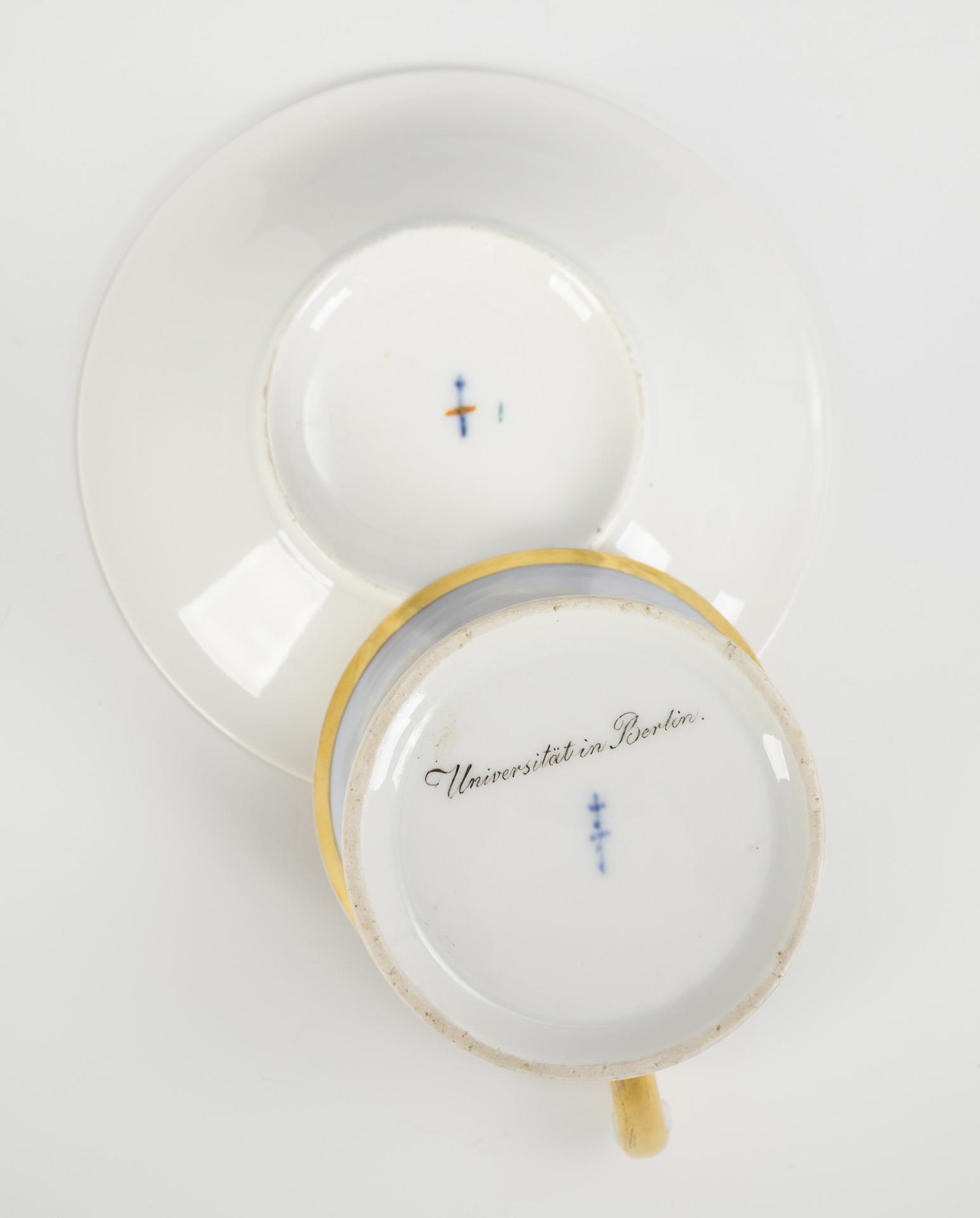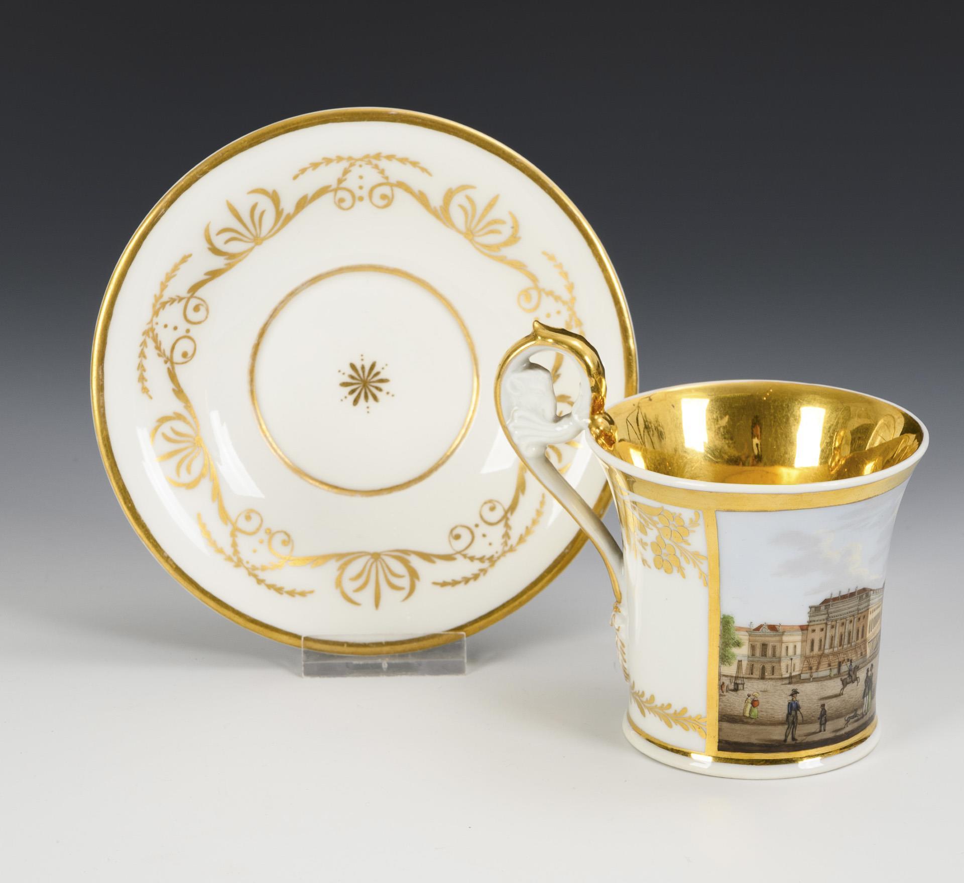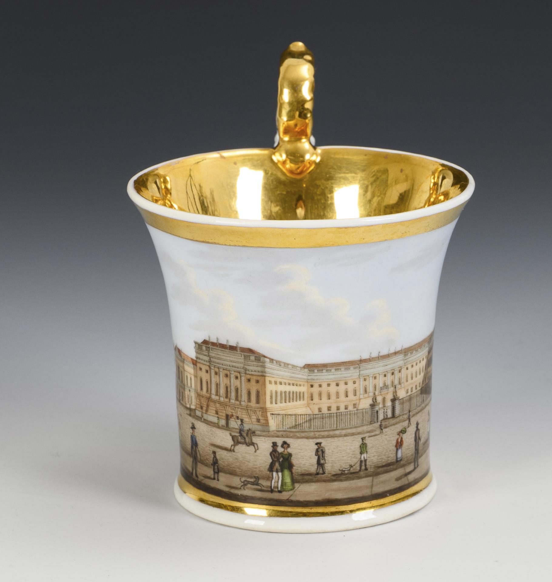 Kratertasse mit Widderkopfhenkel. In einer Rechteckkartusche die unterseitig bezeichnete Ansicht der Universität in Berlin (Palais des Prinzen Heinrich), verso vegetabile Floralmalerei, innen vergoldet.