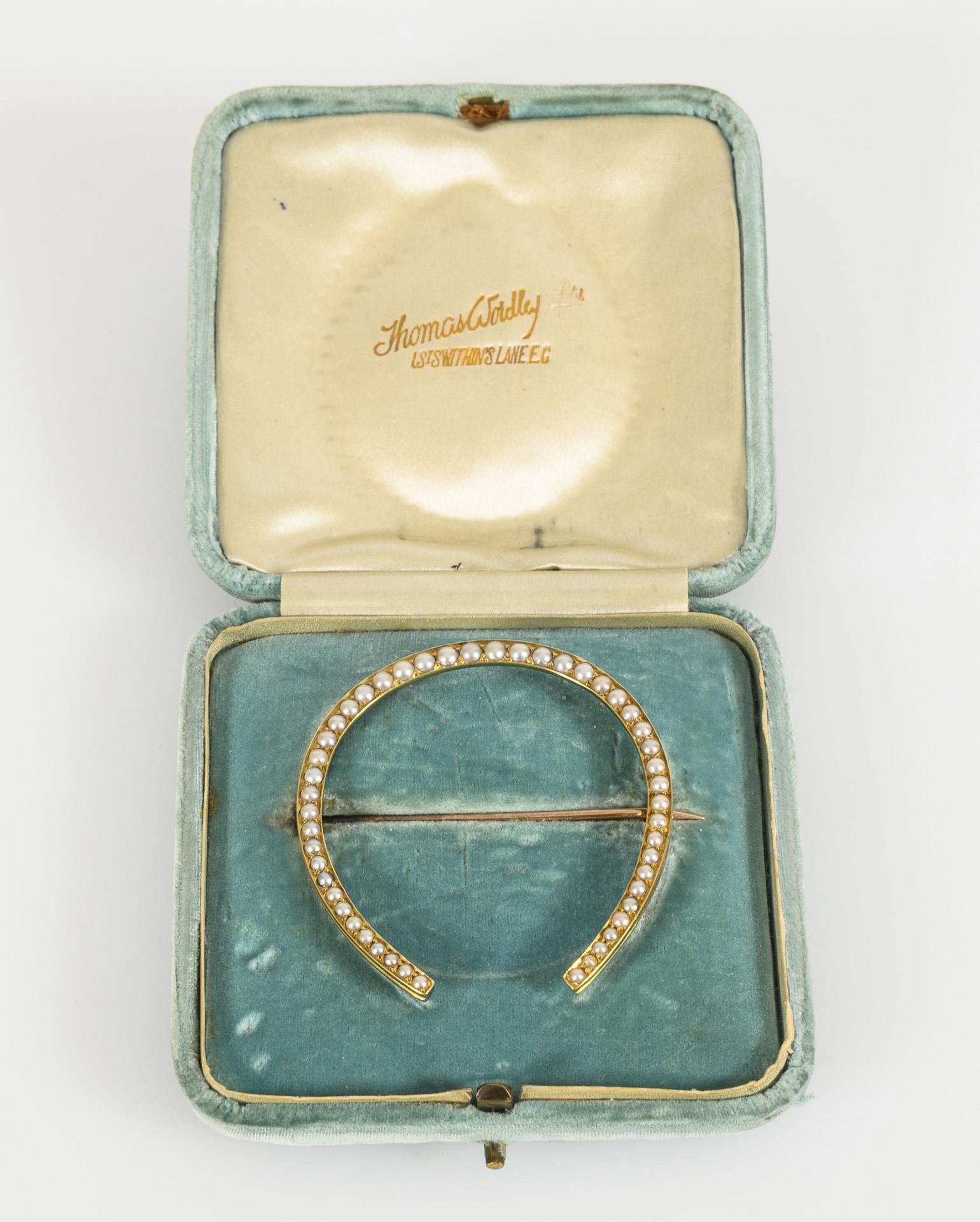 Wohl letztes Jahrzehnt des 19./1. Jahrzehnt des 20. Jahrhunderts. Große Brosche in schmaler Hufeisenform, besetzt mit Perlen im Verlauf. Rückseitig Nadel mit einfachem Hakenverschluss. Nadel minimal verbogen.