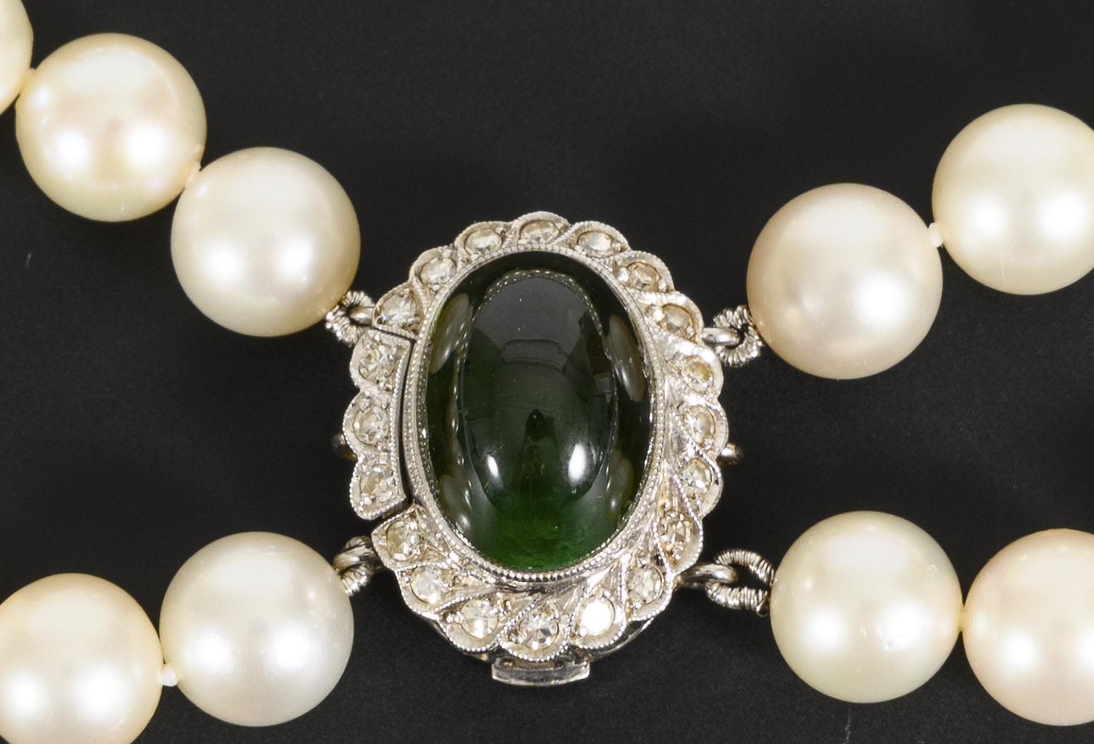 Zweireihiges Akoya-Perlen-Collier mit einem Kastenschloss in Weißgold, darin ein großer, erhabener Turmalin-Cabochon, umgeben von 20 Diamanten.