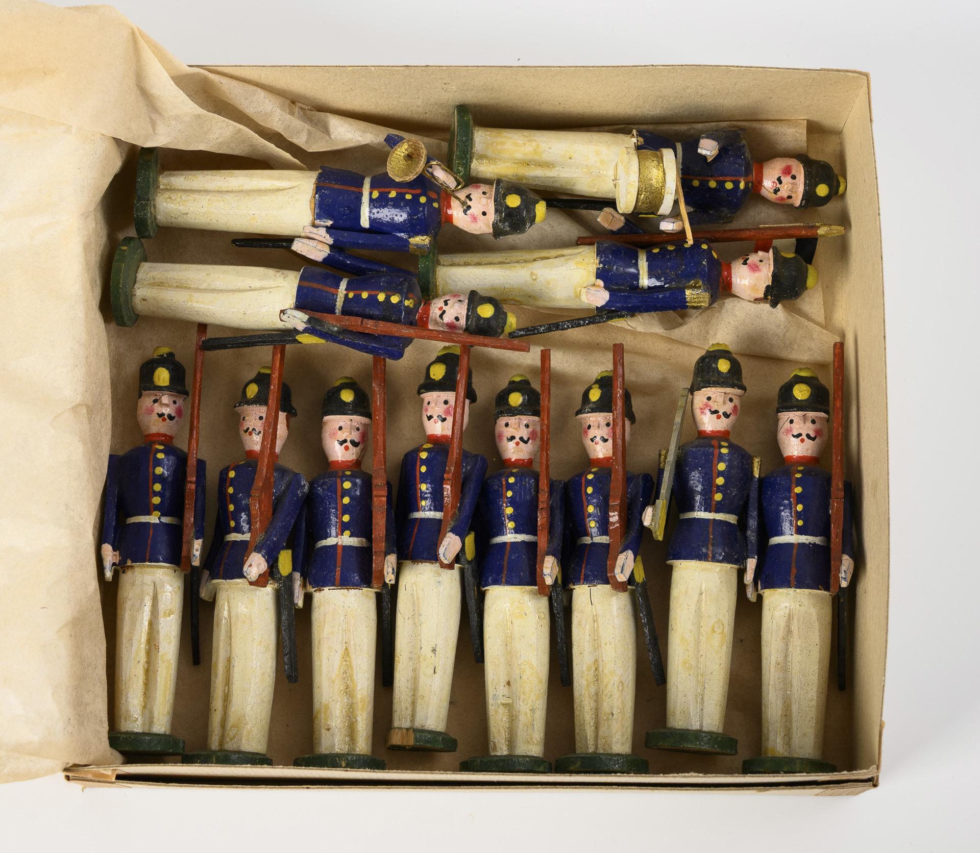 Fahnenträger, 9 Soldaten mit geschultertem Gewehr, Trompeter und Trommler. Blaue Uniformen mit weißen Hosen, Pickelhauben, auf grünen Rundsockeln. In einfachem Pappkästchen. Sehr guter, wohl unbespielter Zustand.