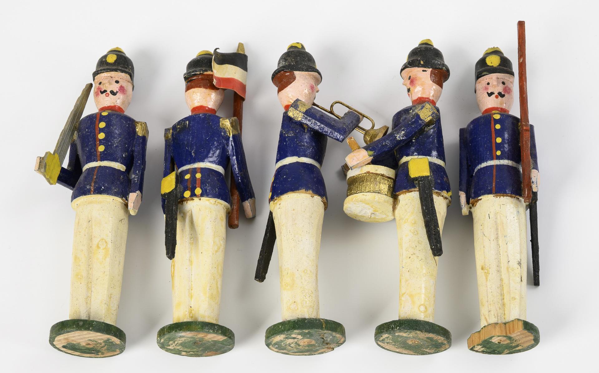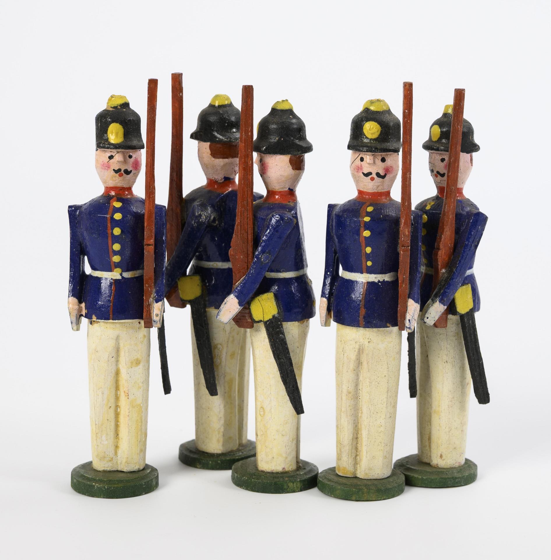 Holz, gedrechselt und farbig lackiert. Figur: H 9,5 cm, mit Gewehr ca. 10 cm.