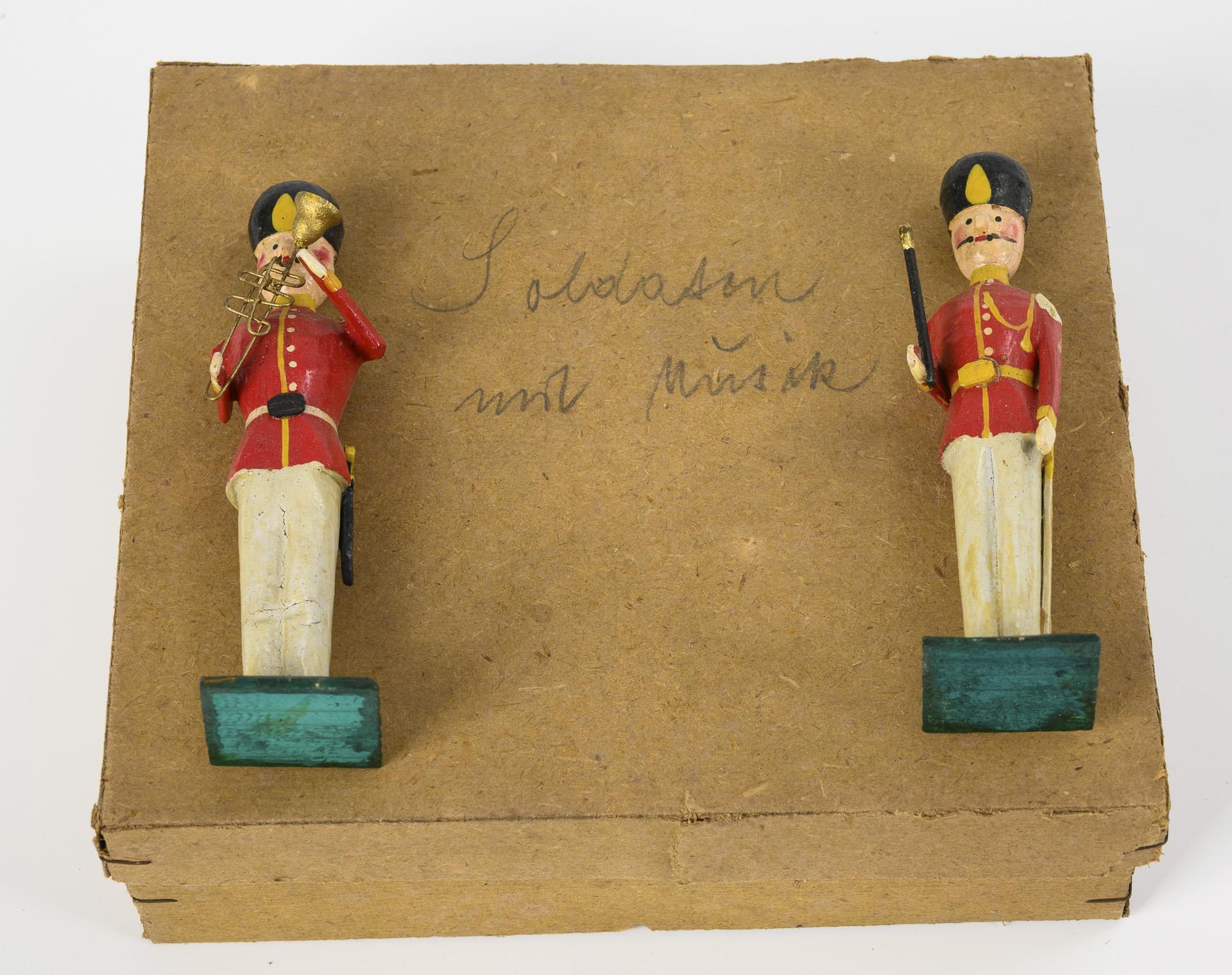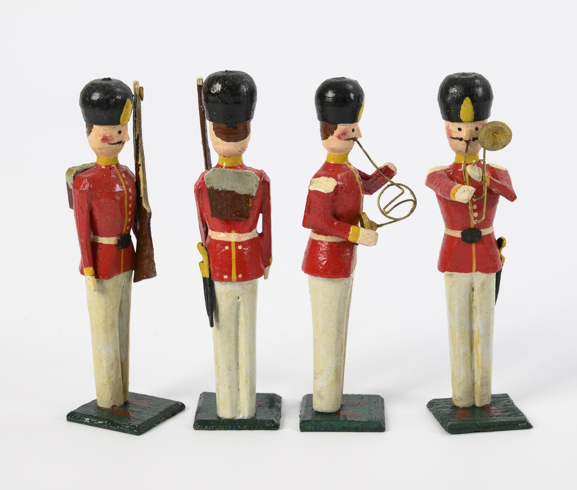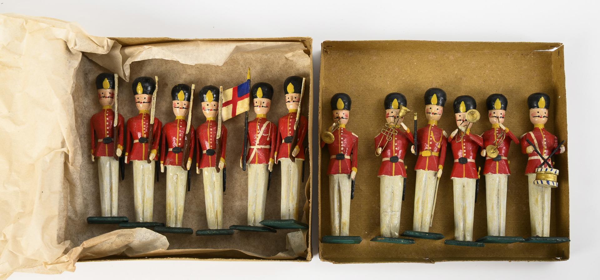 6 Musiker und 6 Soldaten (mit Gewehr, 1 Fahnenträger), alle mit rot-weißen Uniformen und Bärenfellmützen, auf grünen flachen Quadrat-Sockeln. In altem Pappkarton. Unbespielt.