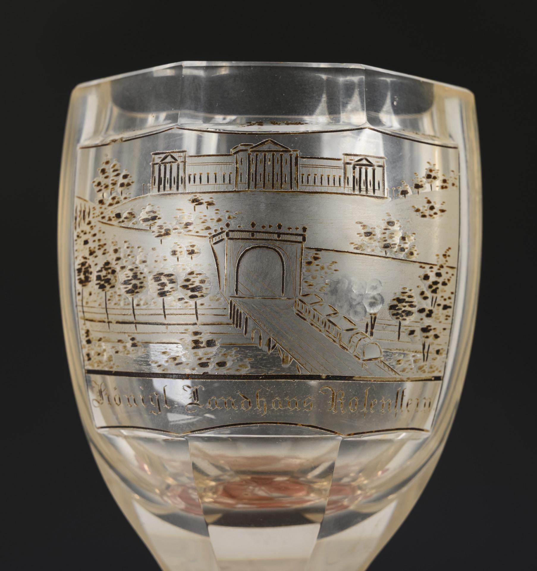 Ovoide, achtfach facettierte Kuppa, kurzer Schaft, achtpassiger Fuß, Bodenstern. Schauseitig auf der Kuppa eine hochgeschliffene Rechteckkartusche mit gravierten und sepiastaffierten, bezeichneten Ansichten von Stuttgart (Cannstadt und Königliches Landhaus Rosenstein). 1x mit minimaler Randbestoßung.