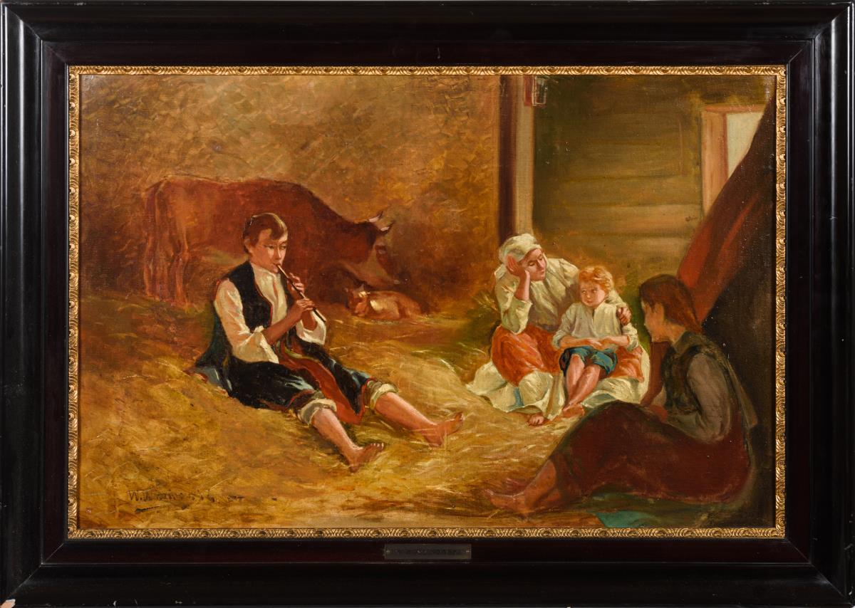 Die Mutter mit den Kindern im Stall mit den Tieren beim Lauschen des Flötenspiels. Anbei polnische Expertise der unabhängigen Gutachterin Teresa Maria Pabis, Krakau. Zwei kleine restaurierte Stellen mit Hinterklebung.