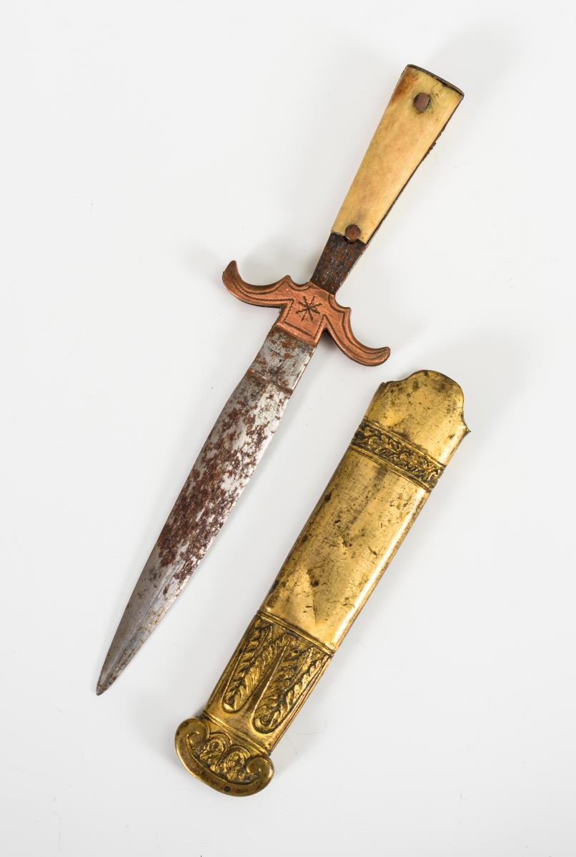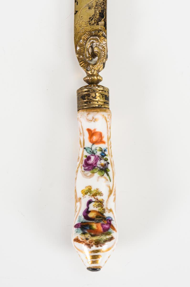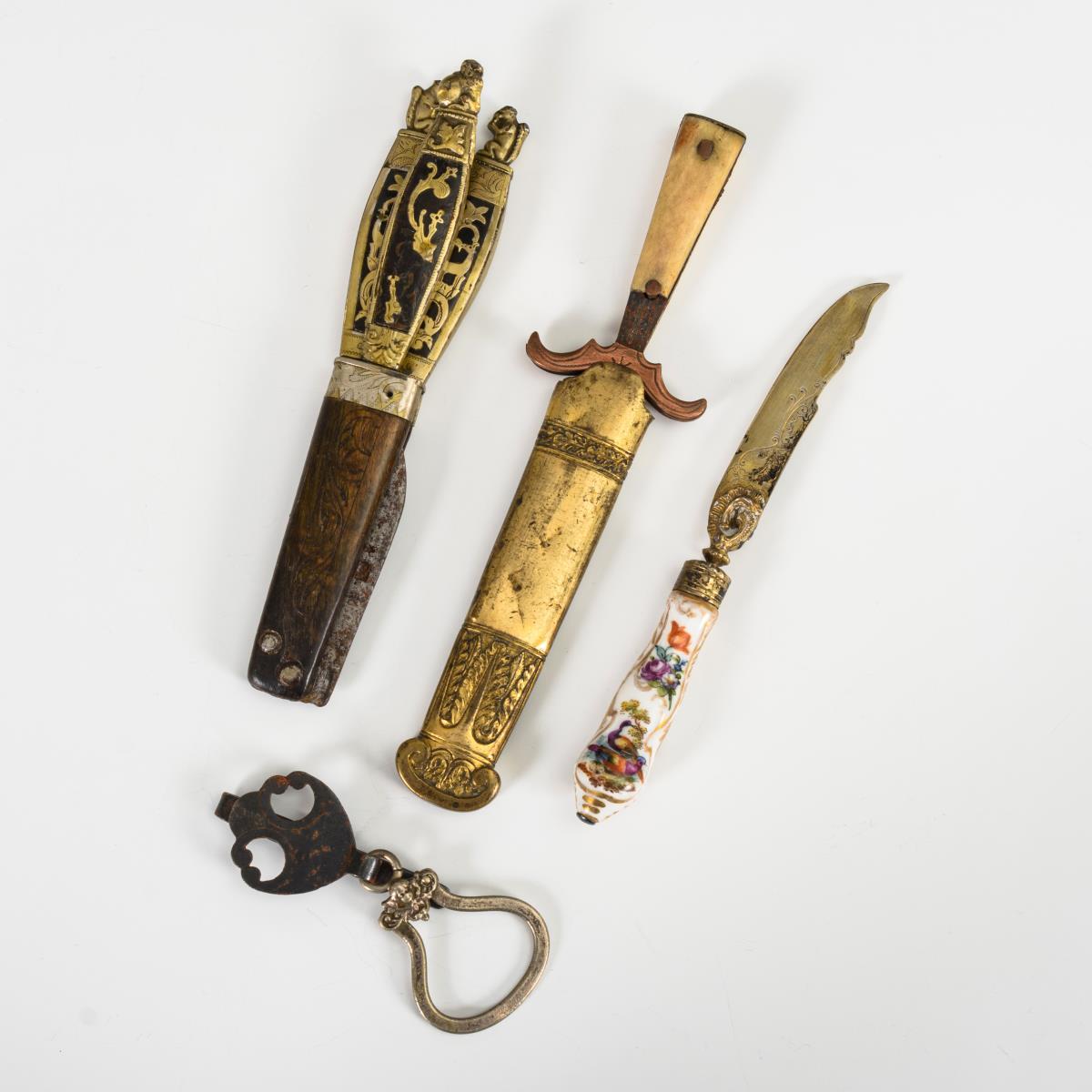 Jagd-Klappmesser mit gravierten Horn-Heftschalen und eingestecktem Besteck: Ahle, Pinzette und Stechgabel; jeweils mit Tierfiguren an den Metallgriffen. / Messer mit bemaltem Porzellangriff bzw. Horngriff. / 1 Messingscheide. / 1 Schlüsselhaken. Häufig starke Alters-/Gebrauchsspuren, Fehlstellen an den Griffen aus Horn und Metall.