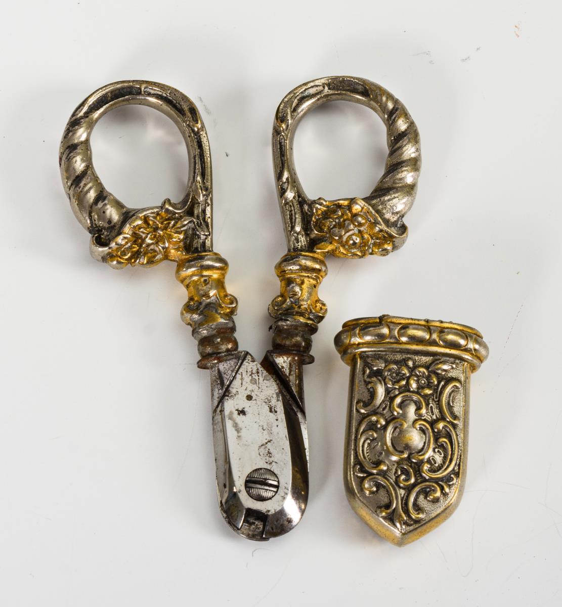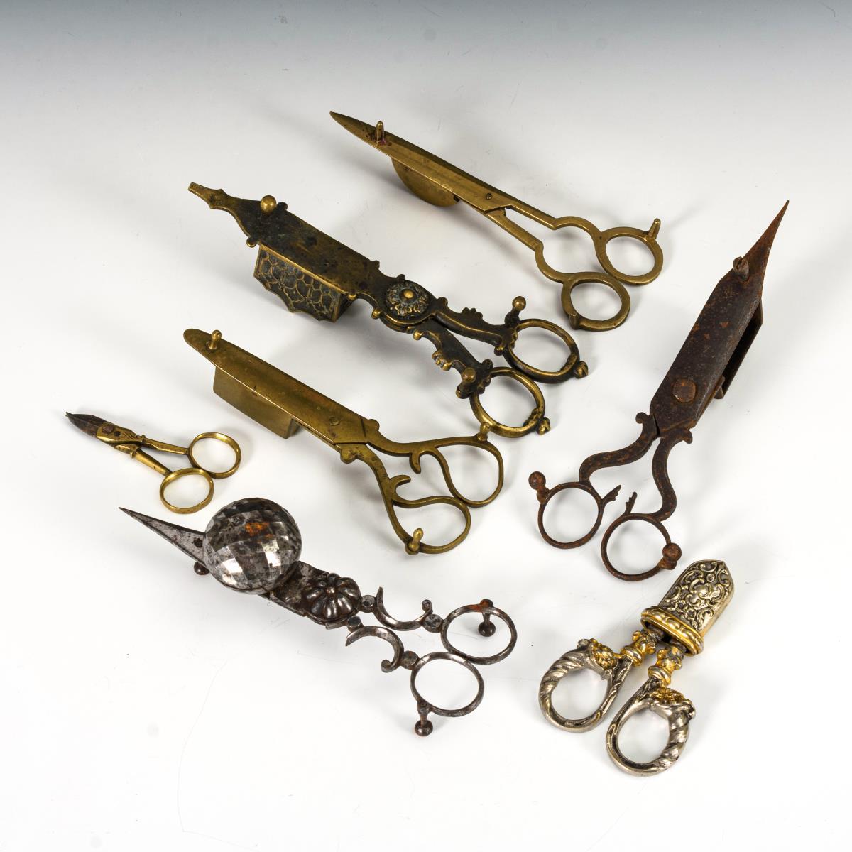 5 Dochtscheren mit Schnuppenfach; 2 kleine Scheren. Zumeist Alters-/Gebrauchsspuren.