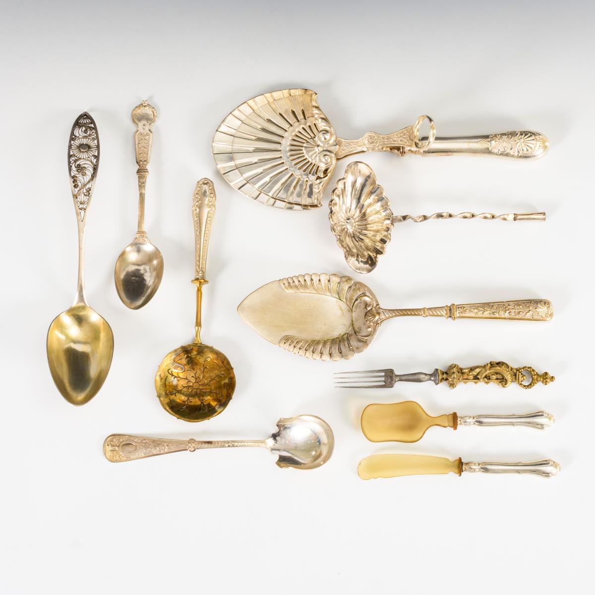 10 verschiedene Vorlegeteile, darunter außergewöhnliche Gebäckzange WMF, Heber, defekte Kelle, Biedermeier-Löffel mit Filigran-Griff etc. Altersspuren.