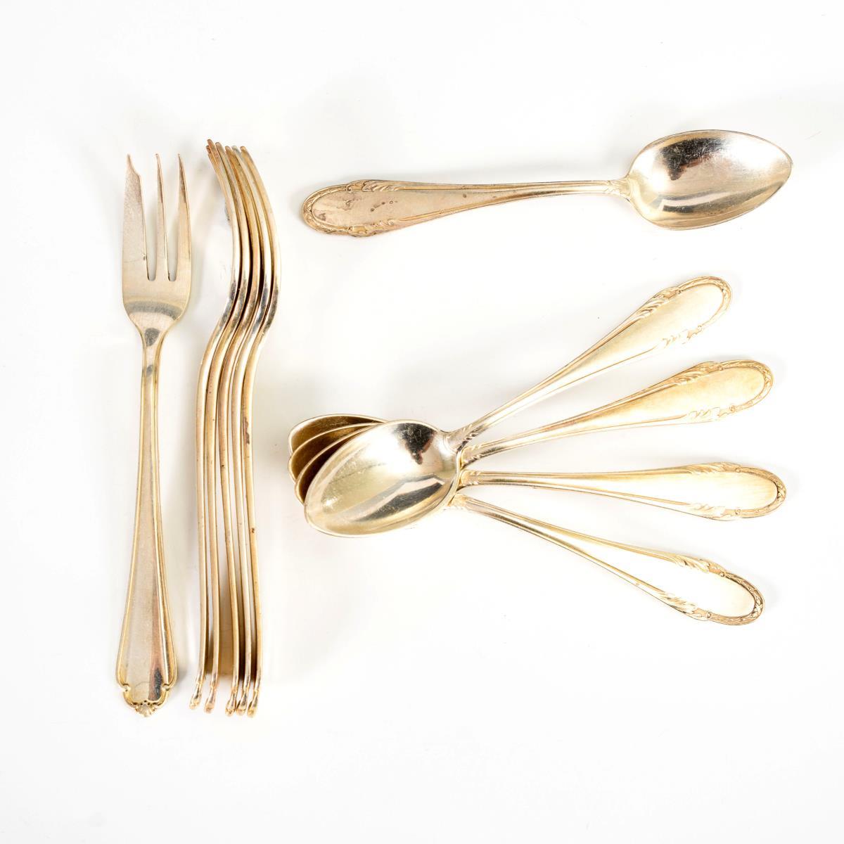 6 silberne Kuchengabeln + 5 versilberte Kaffeelöffel. Richard Köberlin.