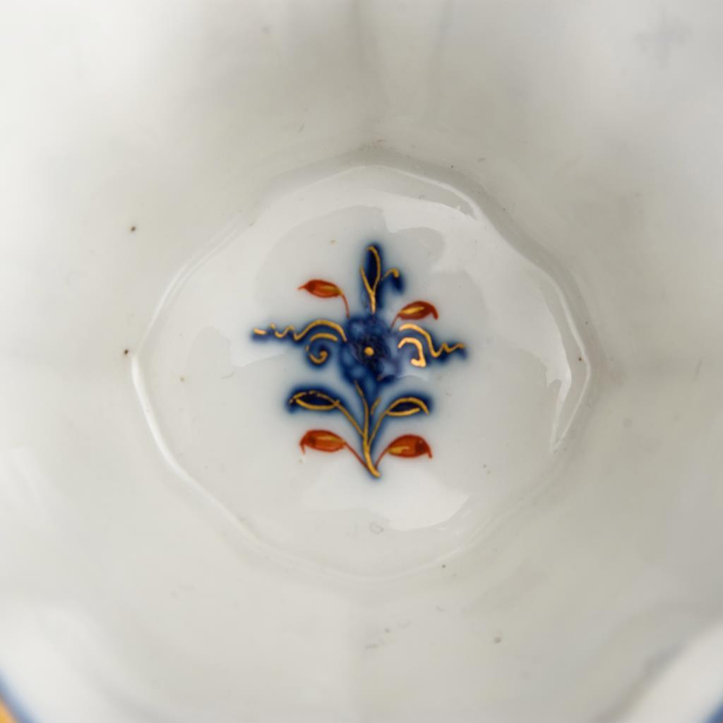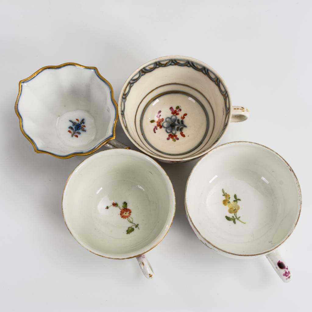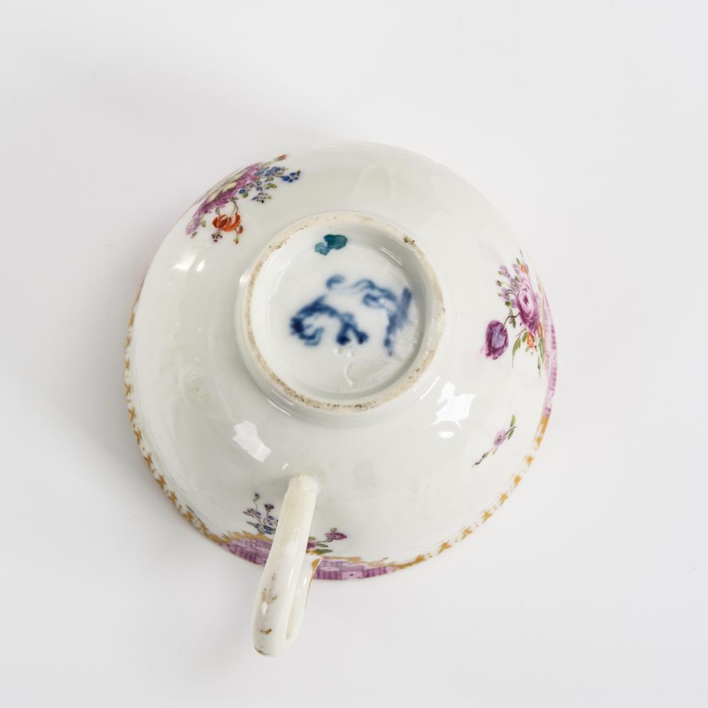 1x mit Blumenmalerei, 1x mit Blumenrelief, Mosaikkartuschen und Blumenmalerei, 1x mit Zwiebelmuster, 1x mit Fels- und Vogelmalererei. 1x mit Haarriss, 1 Tasse restauriert.