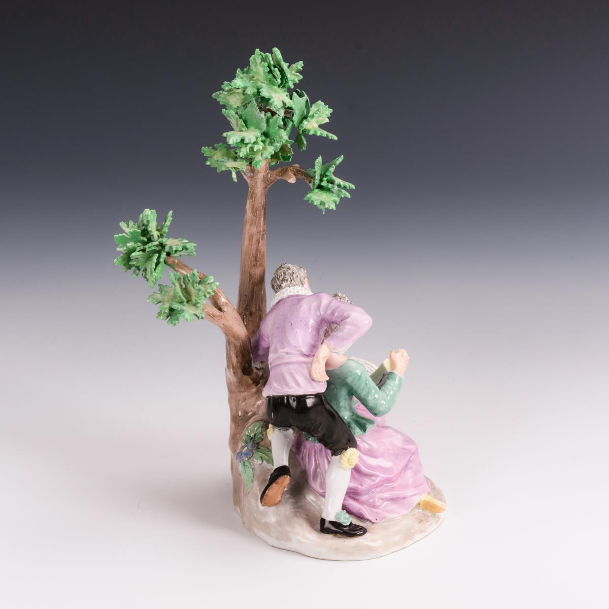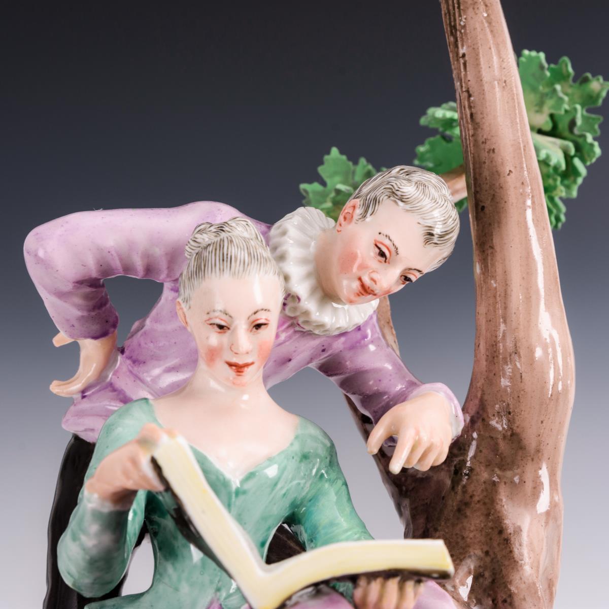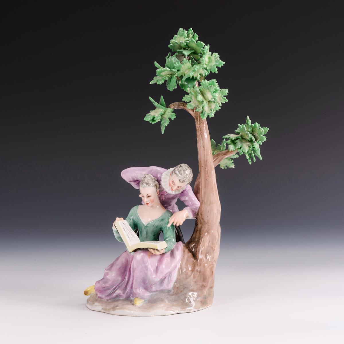 Galantes Paar mit Buch unter einem Baum. Restauriert, unterseitig Brandriss.