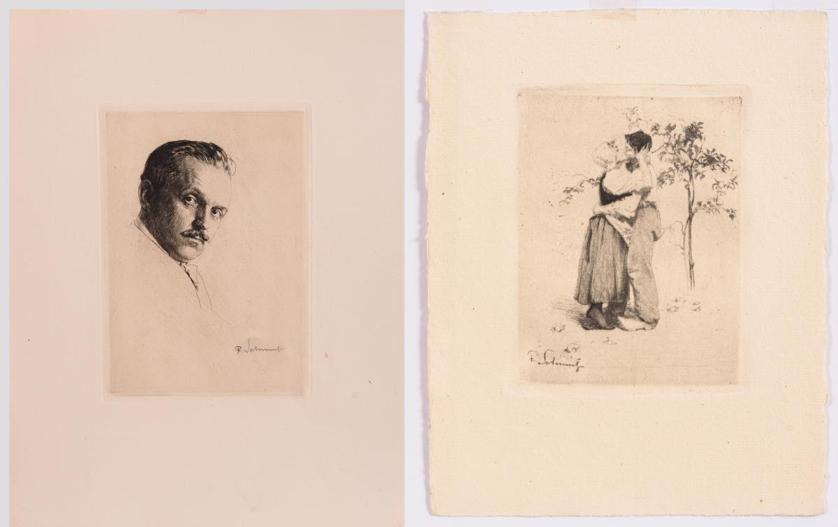 Der Kuss, Platte: 12 x 10,5 cm, Blatt: 19,5 x 15 cm; Passepartout: 38 x 30,5 cm | Selbstbildnis, Platte: 19,5 x 14 cm, Blatt: 34,5 x 26 cm, Passepartout: 44,5 x 36 cm.