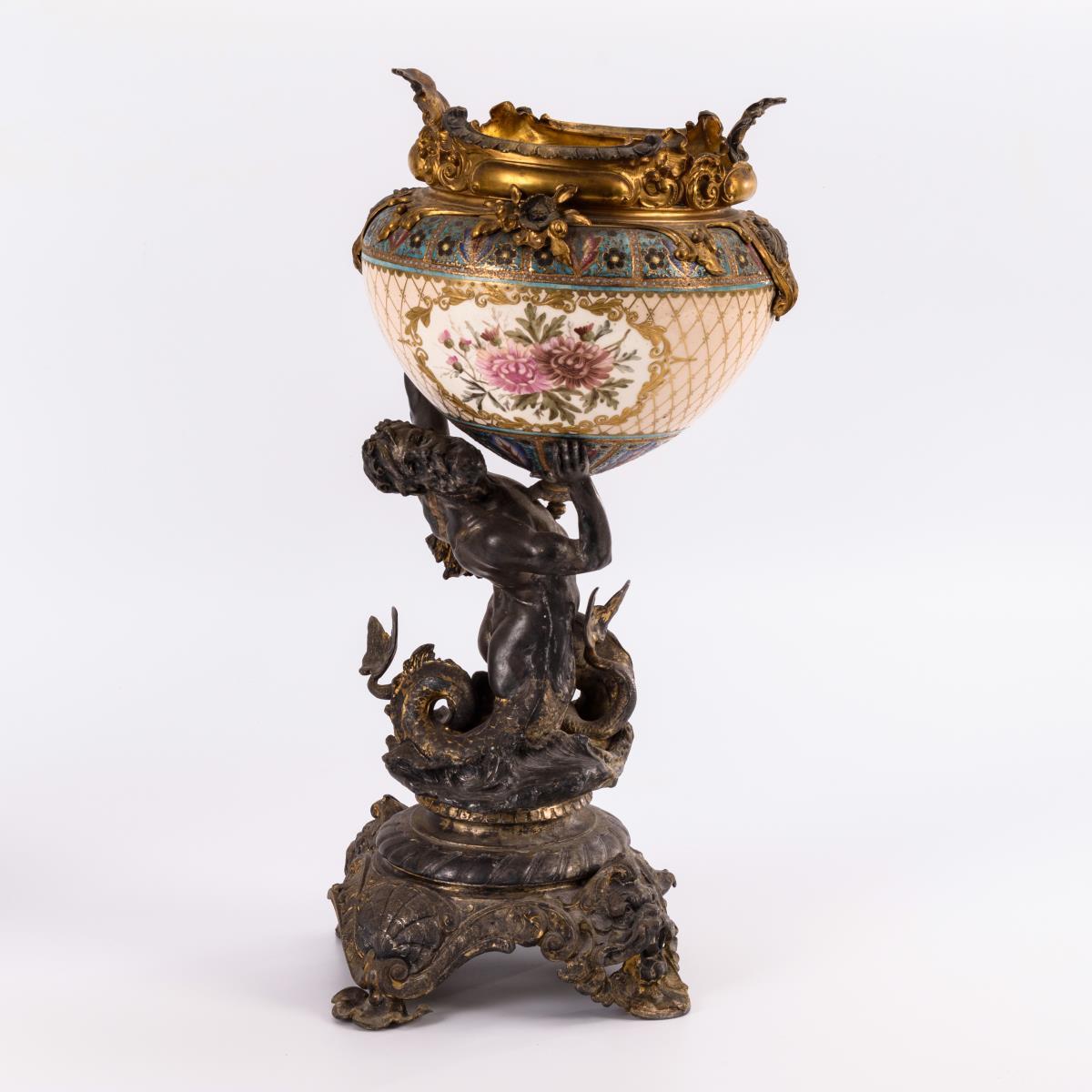 Keramikschale mit Blumenmalerei und einem floralen, metallmontierten Reliefrand, getragen von einer Neptunplastik auf Vierfußsockel mit Löwenmaskaronen. Alters- und Gebrauchsspuren, teils Defekte, Schale gelockert.