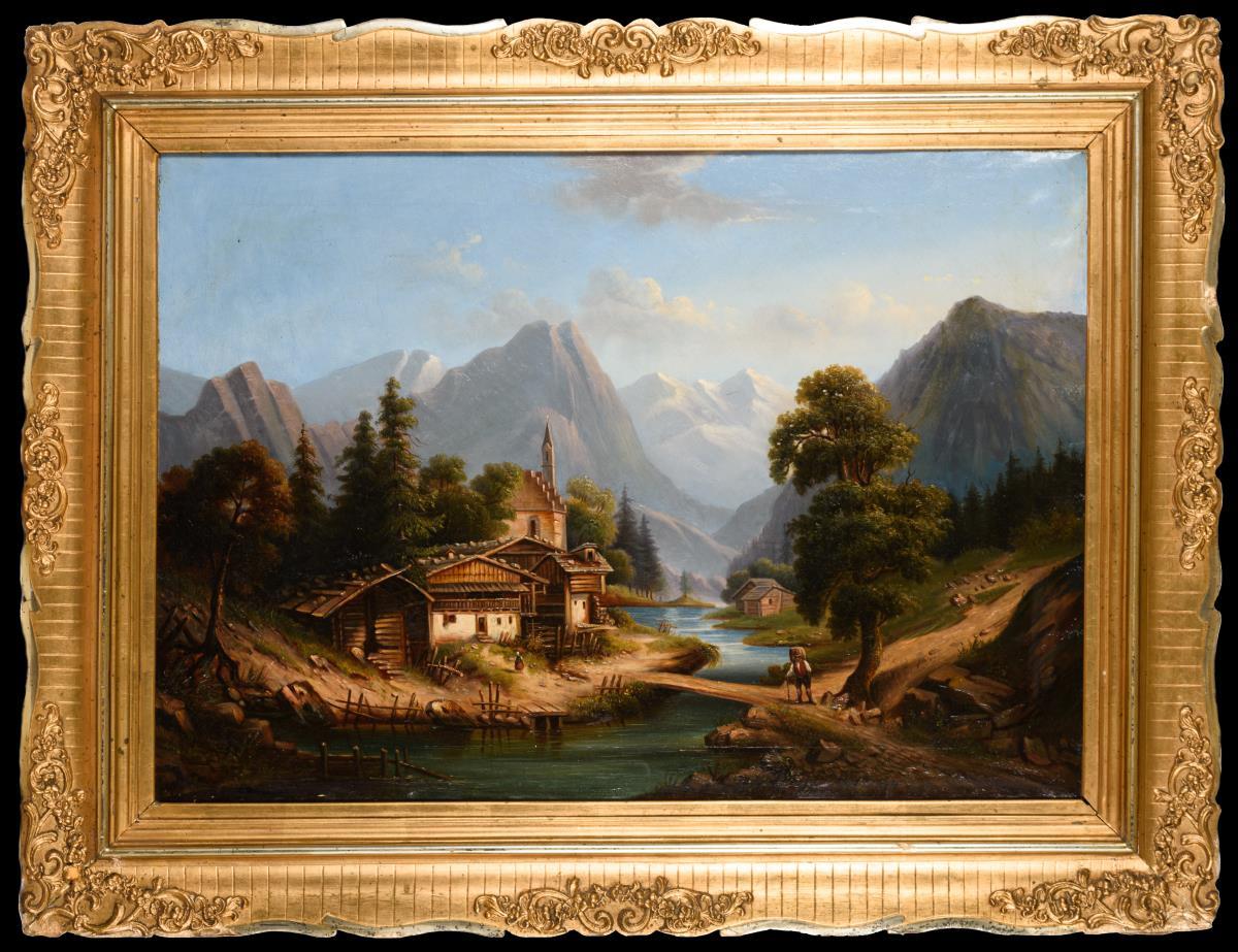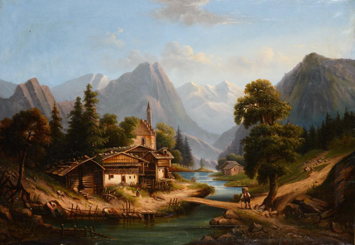 Spätromantiker: Gebirgssee mit Bauernhäusern