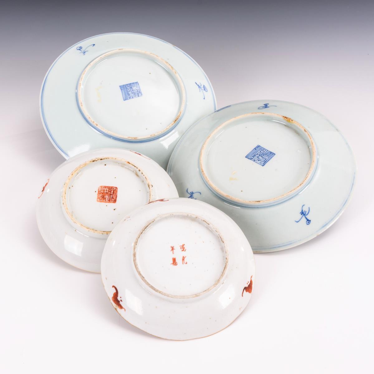 Zwei sehr ähnliche Teller in Unterglasur-Blau mit stilisierten Blüten, Unterseite dezent dekoriert. / Kleiner Teller mit leicht gewelltem Rand und polychromer Emailbemalung, zwischen Blüten Schriftzeichen für doppelte Freude, Unterseite mit stilisierten Fledermäusen. / Kleiner Teller mit roter Päonie und Schriftzeichen, Unterseite mit leichtem Ascheanflug.