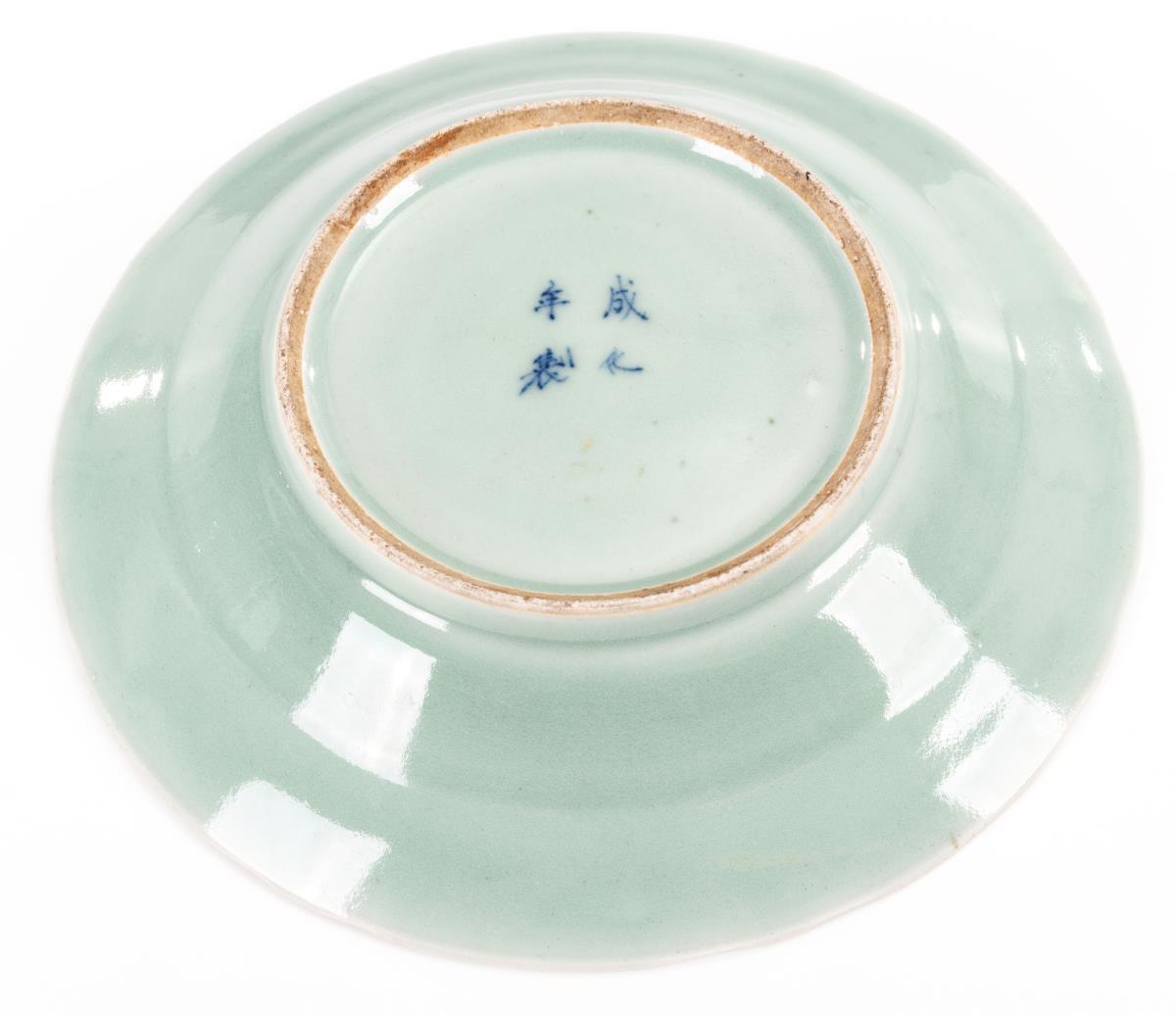 Blauer Teller mit Schriftzeichen.